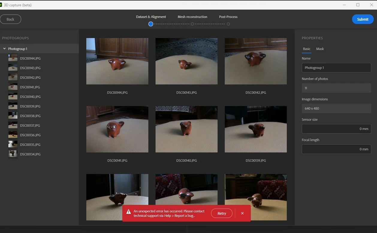 Whenever I hit next steps... no matter the settings I use low or high / sorting order etc I get the error the photos cannot be aligned and to retry. Whenever I retry I get an unknown error telling to submit a bug. I cant for the life of me figure out what is going on, I tried less images, more images etc and still get same error. If I cant use it for stuff even shot in a studio I am not sure how I can use it with some general shots from my iphone so trying to figure out what might cause this. Sadly I can't share these specific photos due to being a client project, but was just wondering in general what causes this error and what I can try on my end?