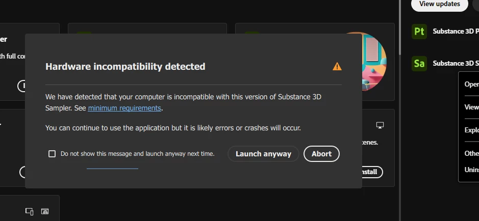 Hello, so my Substance 3D Sampler is saying "Hardware Incompatibility detected" Even though my pc passes all the requirements. Aswell as i have my Nvidia GPU updated to the latest version (576.52)