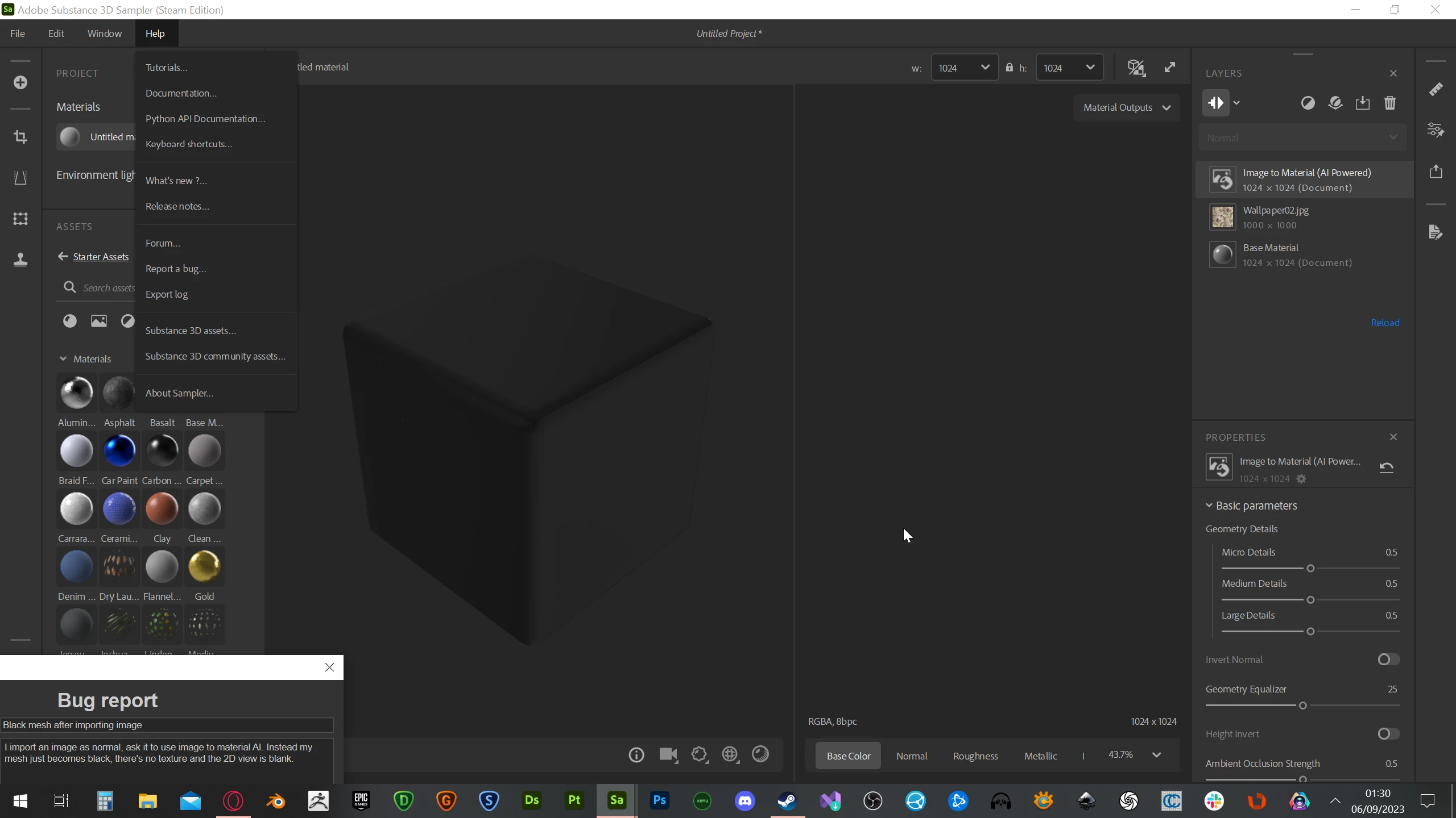 I don't really know how to describe this correctly but basically after opening an image to be converted to a material using AI I can see it loading but once it's done I'm just left with a black mesh and no textures whatsoever 😕😕