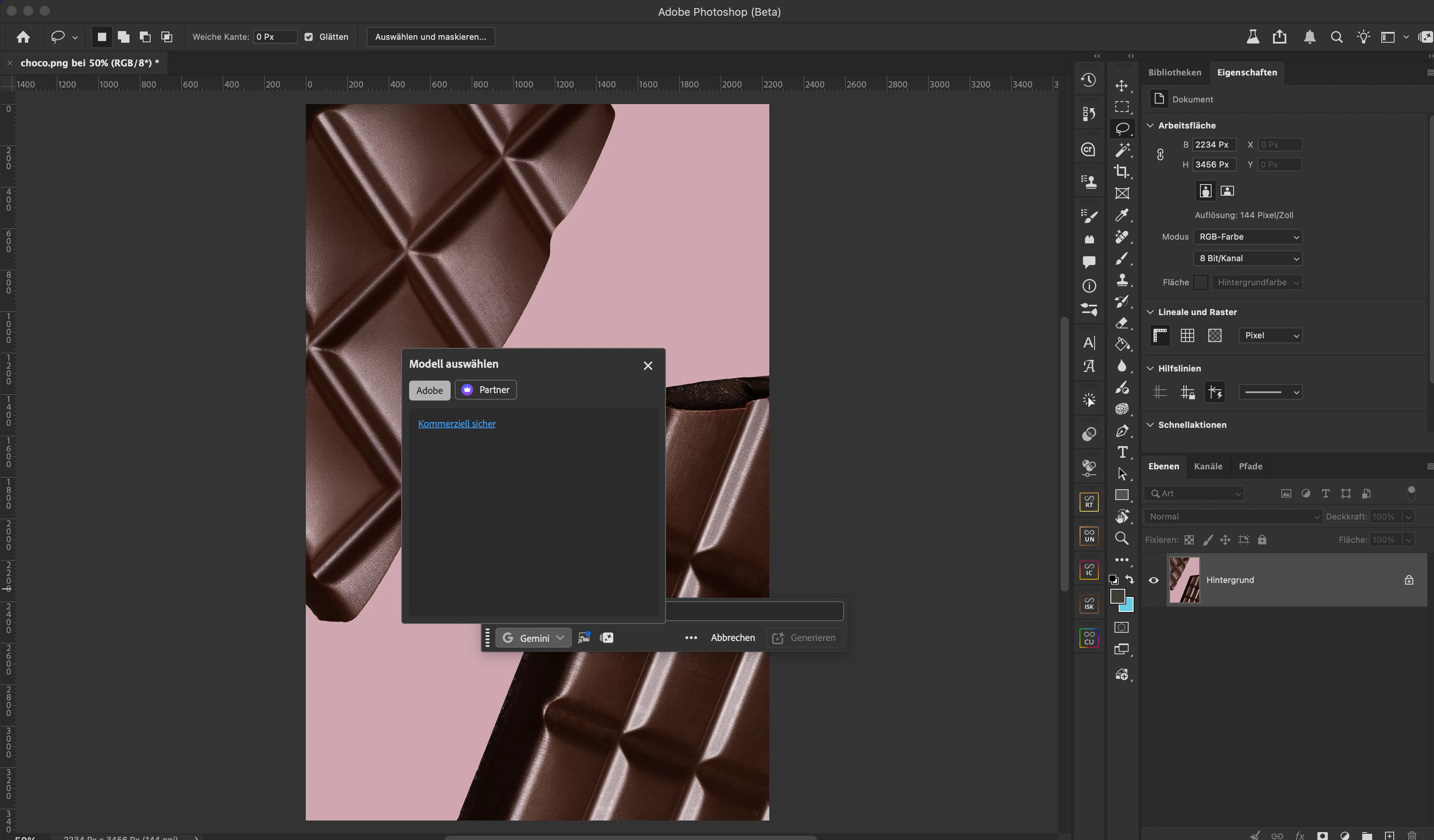 Since updating to Photoshop Beta 27.6, the model selection interface in the Contextual Task Bar has become non-functional. While the 'Choose a model' dialog box triggers and opens correctly, the selection pane remains entirely blank, failing to load or display any available AI models (Firefly, Gemini, or Partner models).