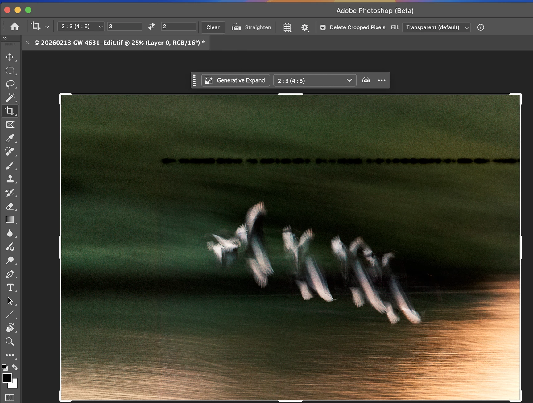Large black artifact after AI Generative Expand followed by AI Sharpen (Topaz). Black line/artifact is on long edge of original file