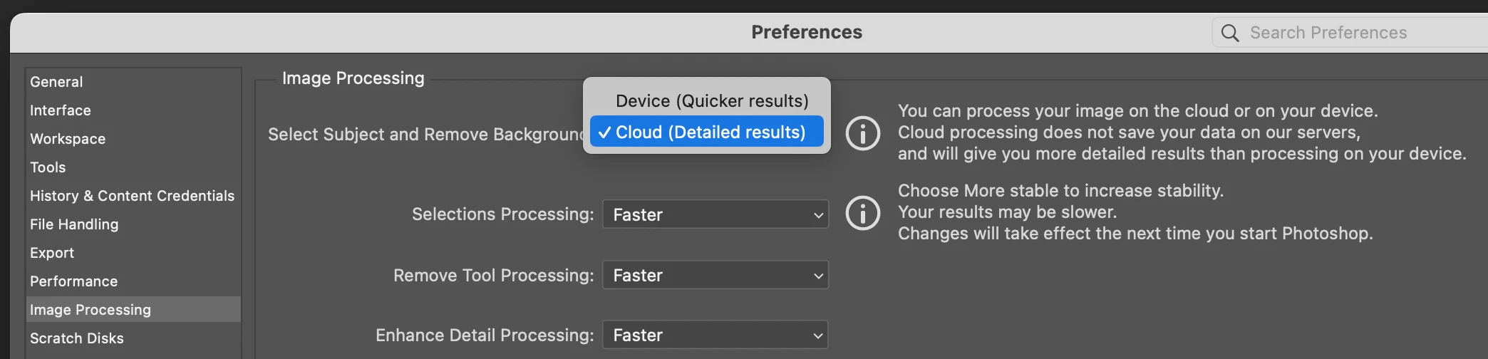 In Settings > Image Processing, I switched to Device and tested with the same result.
