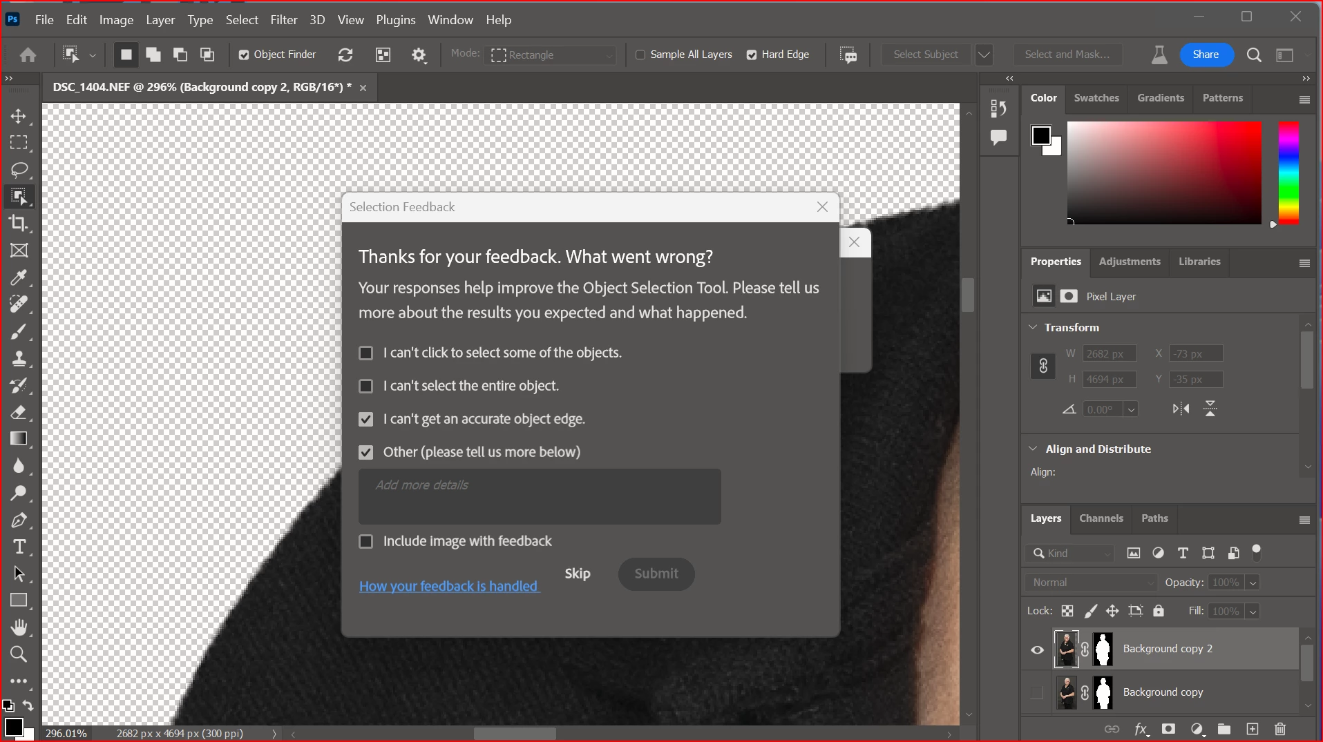 I downloaded the Beta so I could test out the Background Removal, as I am providing down to the pixel edits and am spending a ton of time removing or adding back in subject/background edges. The selection is no better than in Photoshop and when I went to submit a comment in the Beta PS, the comment menu showed up, but not the ability to write a comment or add a picture (and yes, I clicked those boxes). When I exited the comment window, I got a "successfully submitted" message - or something similar, when I hadn't been able to give my feedback.