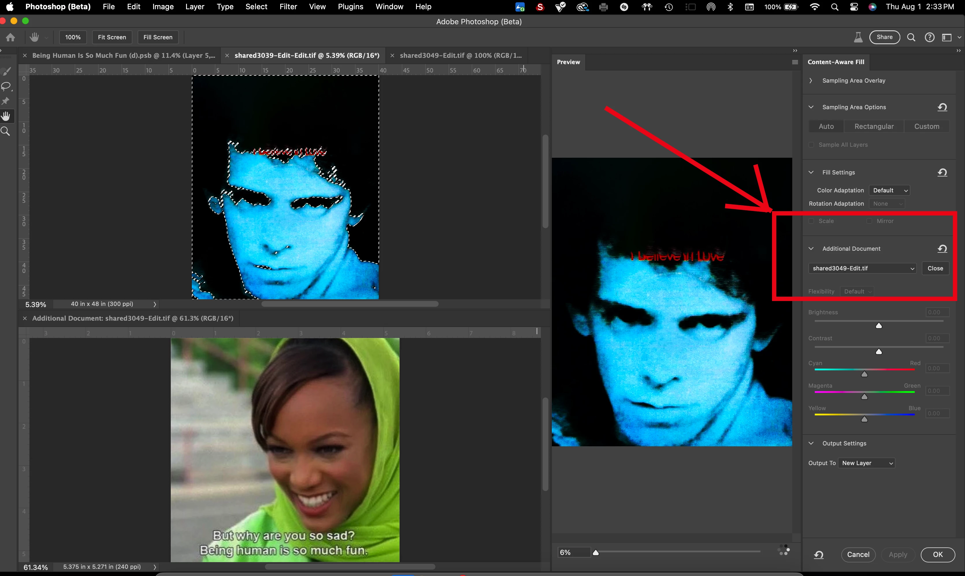 When I say that it happens constantly, specifically I mean it happens 100% of the times that I have tried to use this specific function noted in the screenshot below "additional document" (can't test this in regular photoshop because this feature only exists in beta), and about 80% of the time when using the Content Aware Fill function even without choosing this "additional document" feature, if/when I am using the feature on a large amount of space within an image.