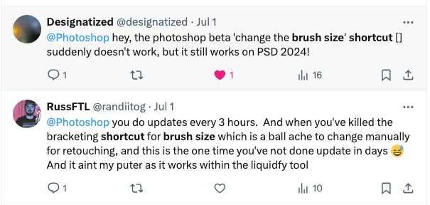 brush size' shortcut [] is not working in Photoshop Beta. Looks like I am not the only one. (See attached for other twitter X users mentioned the same issue)