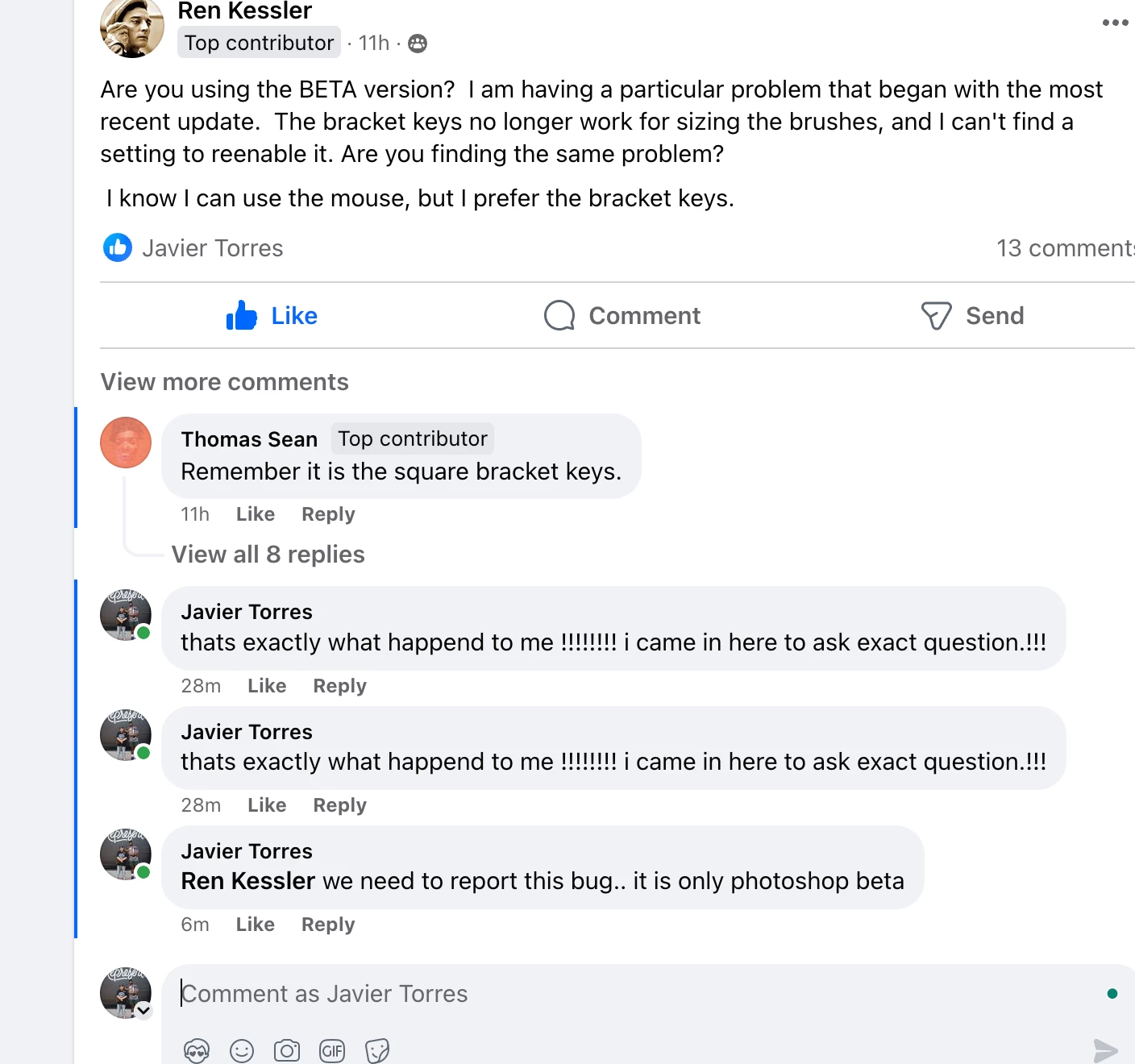 I am currently using the Photoshop Beta and have encountered an issue where the square brackets [ and ] for adjusting brush size are not functioning. Here are the details of the problem: