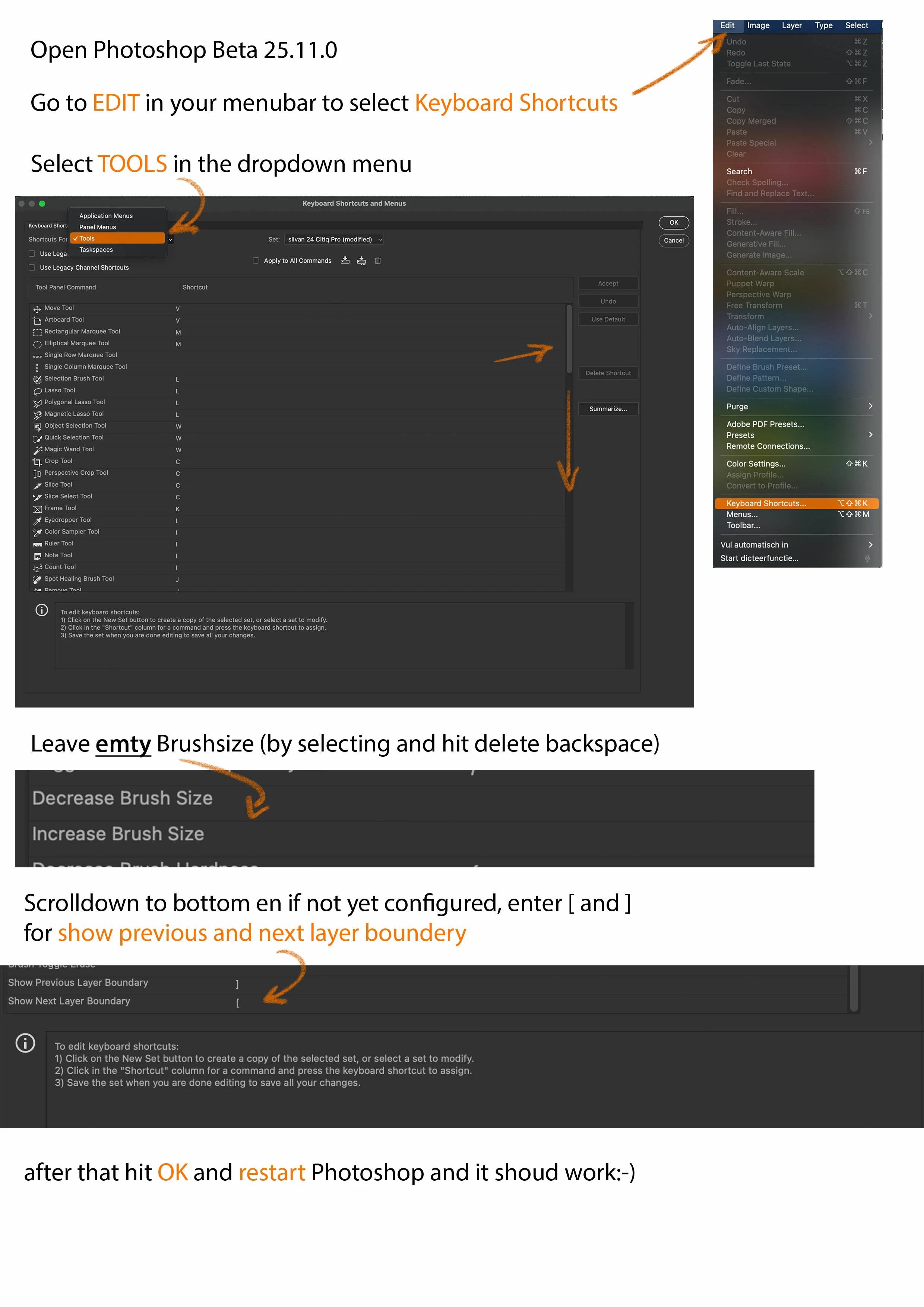 The [ ] brackets don't work any more to increase and decrease the size of the brush. I have tried changing my keyboard to English US and English Australia and it still doesn't work. I've tried looking at the cursor preferences and shortcut preferences, and the [ ] are there but still not working when I use the keyboard.  I've tried rebooting my computer and restarting Photoshop Beta but it still doesn't work.