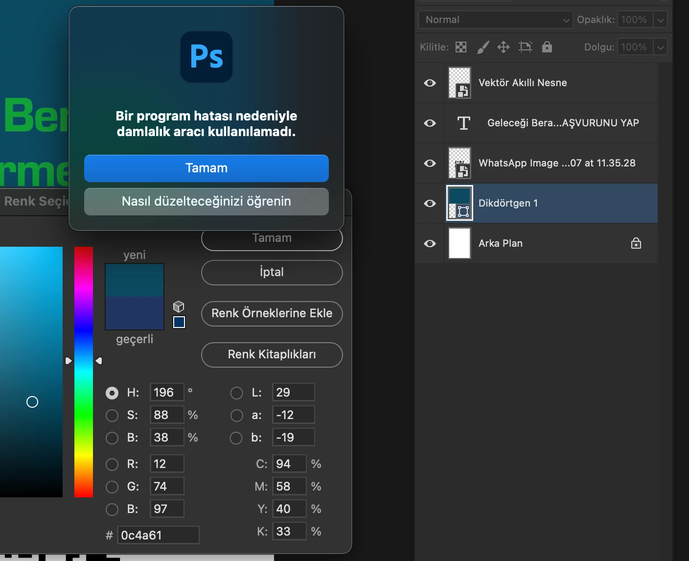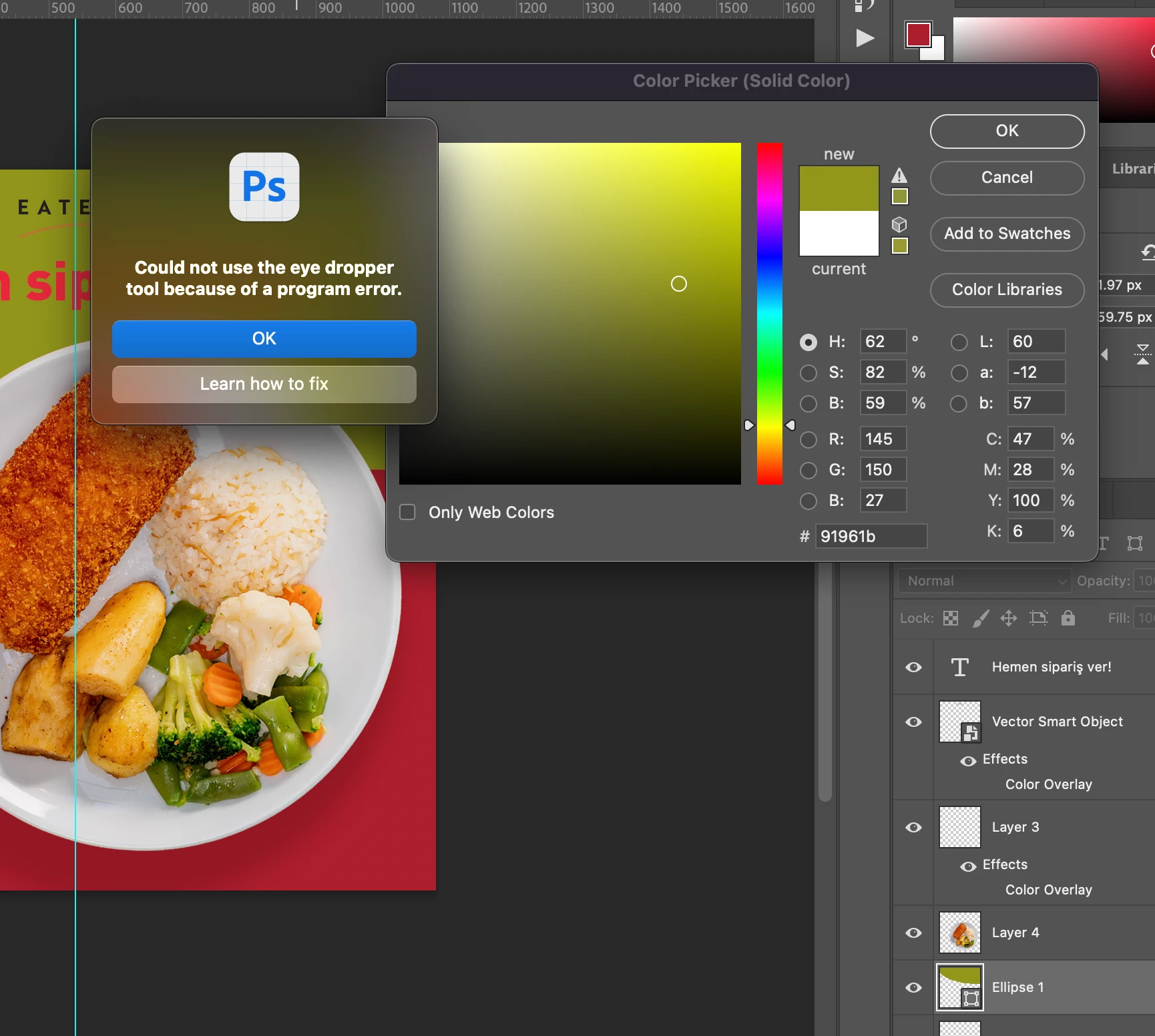 I cannot select color from an image in a rectangle with the eyedropper tool, the program gives an error, I tried it on many documents and I get the same error, so I think it is an error caused by Photoshop or is there a solution?