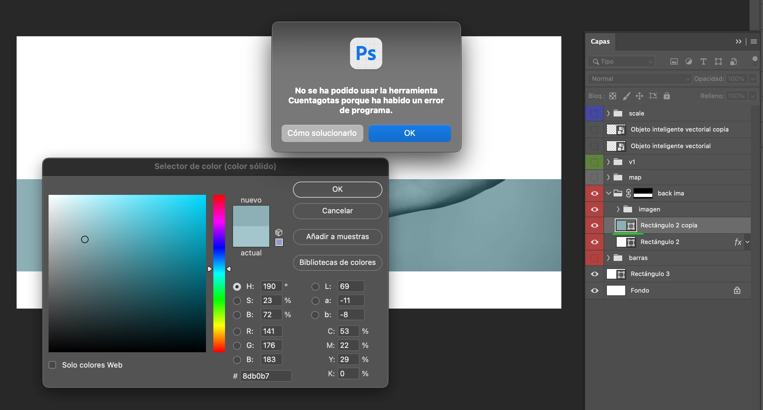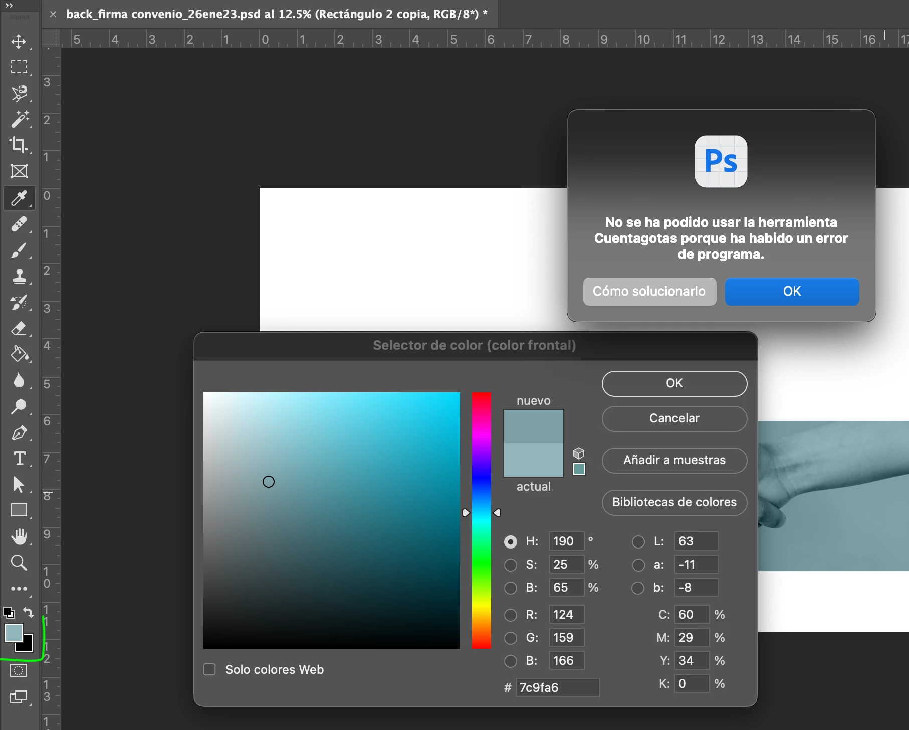 Al querer cambiar el color de una capa de forma doy doble click en el icono de la ventana, abre el -Selector de color- trato de tomar una muestra con el -Cuentagotas-, logra tomar la muestra pero inmediatamente sale un aviso: