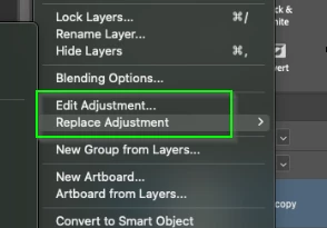 I apply an adjustment to the image by creating a new layer, for example a curves adjustment. On the new layer, I right-click and duplicate that layer. I go to the new layer (duplicate curves), right-click again, and look for the option: replace adjustments. A menu appears with other adjustments such as levels, vibrancy, explisure, etc. I choose the one I'm interested in. Before, I would change it to the desired adjustment. Now nothing happens.