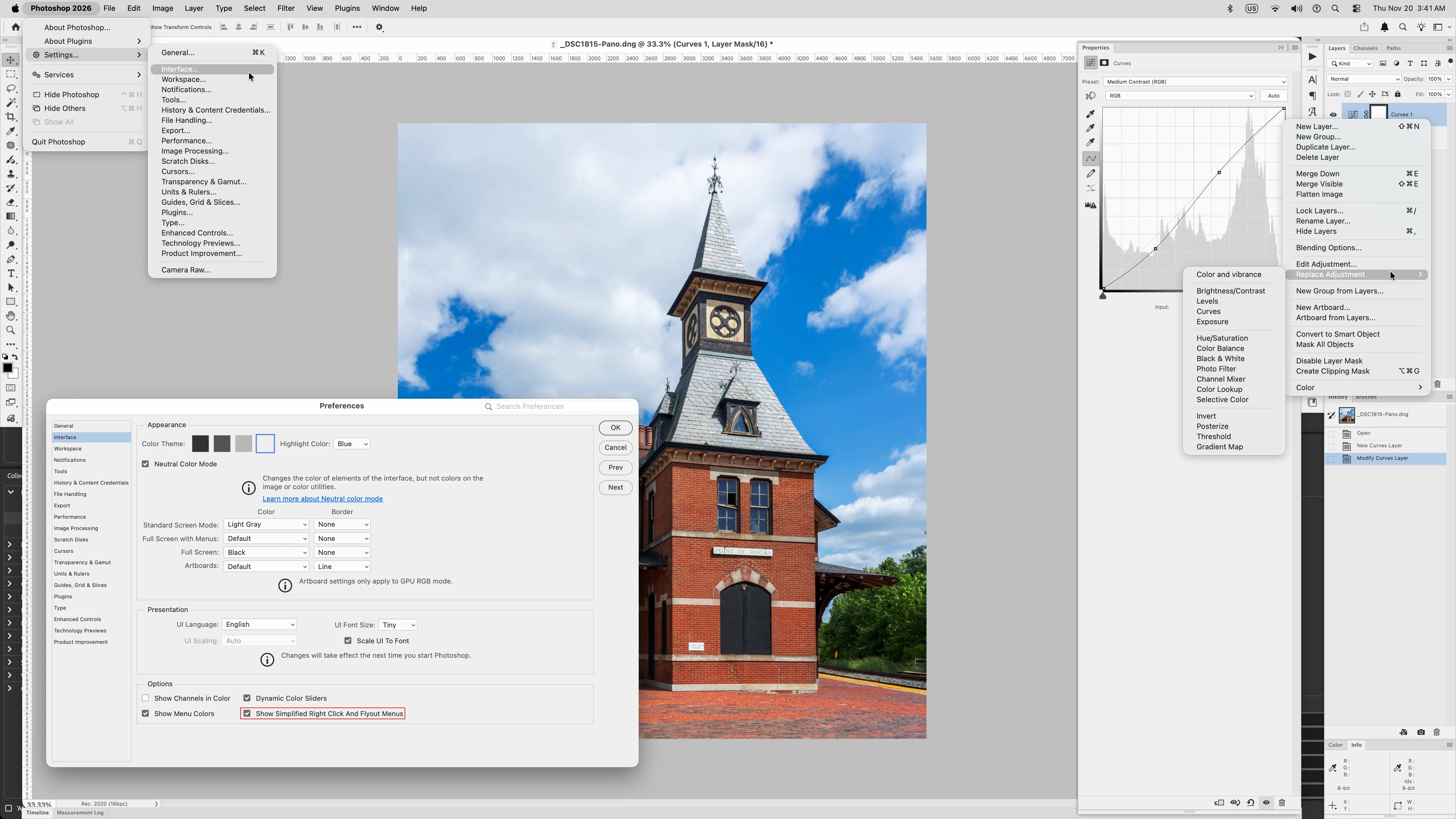 In both regular Photoshop 2024, 2025, 2026 and Photoshop Beta which is of this post 27.2, one needs to go to Photoshop 2026 or Photoshop Beta>Settings>Interface and check Show Simplified Right Click And Flyout Menus and then right clicking to the right of the Adjustment Layer or Layer Mask will show the Replace Adjustment menu item.