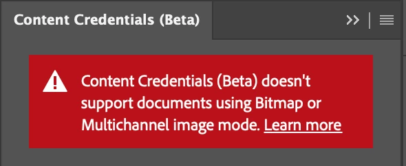 I'm getting the following warning in Photoshop (25.6.0 and 25.7.0 (beta) - MacBook OSX 13.6.1) , even though my document is using RGB color mode. I'm also unable to find any of the content credentials options described here - https://helpx.adobe.com/uk/photoshop/using/content-credentials.html . There is no content credentials (beta) option under the Window tab, and in Preferences, there's only a History tab, not History & Content Credentials tab.