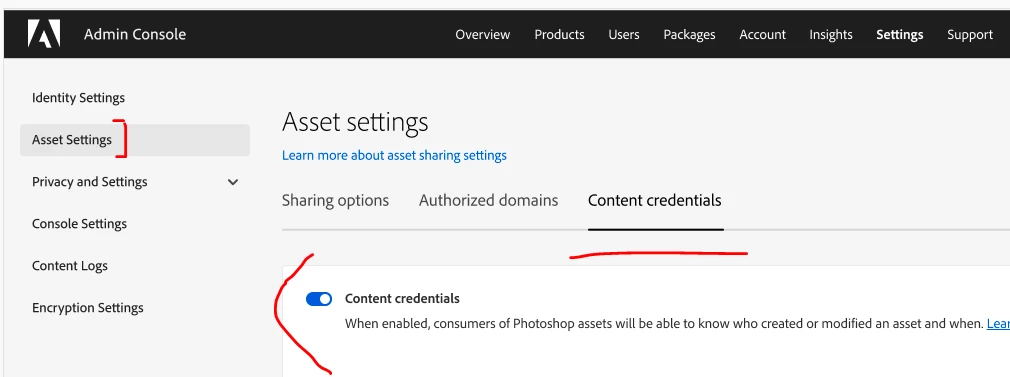 • Enterprise accounts are enabled for Content Credentials by default, unless your administrator has disabled it