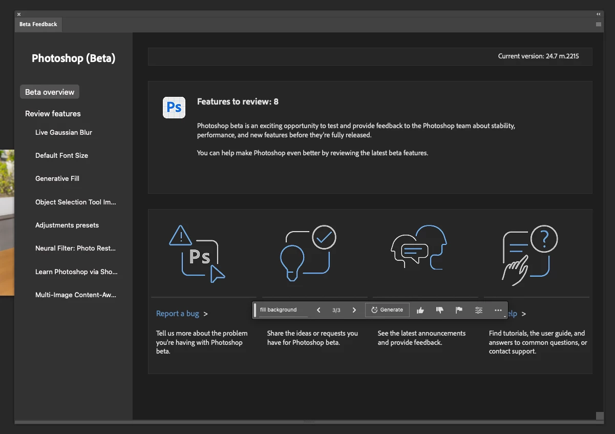As the tietle says, when you are using Generative fill, the toolbar floats above the photoshop(beta) feedback window when it's opened...