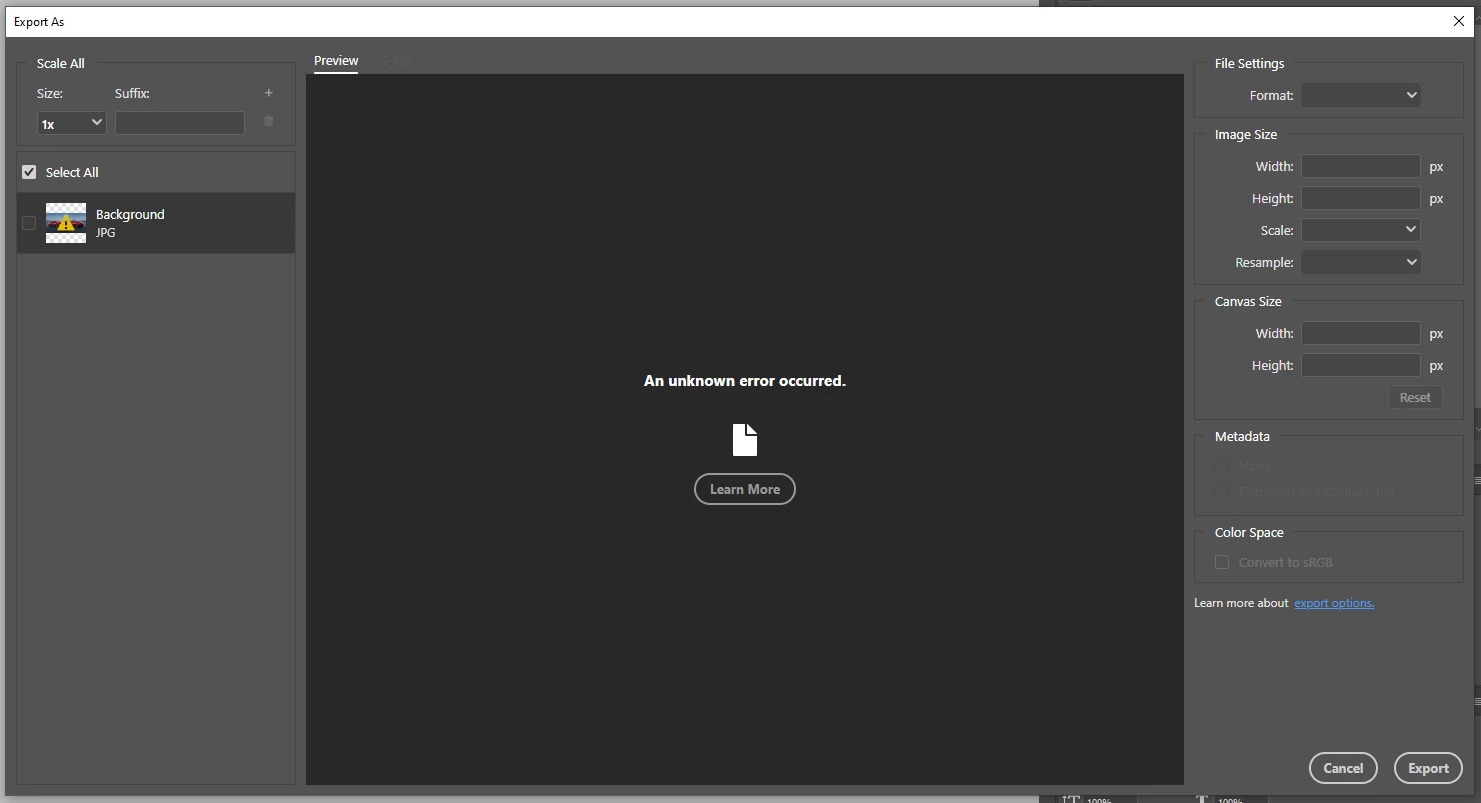 When I choose “Export as” from the file menu, or rightclick in the layers panel to export a layer, the window that pops up for exporting just says “An unknown error occurred” and I cannot select anything.