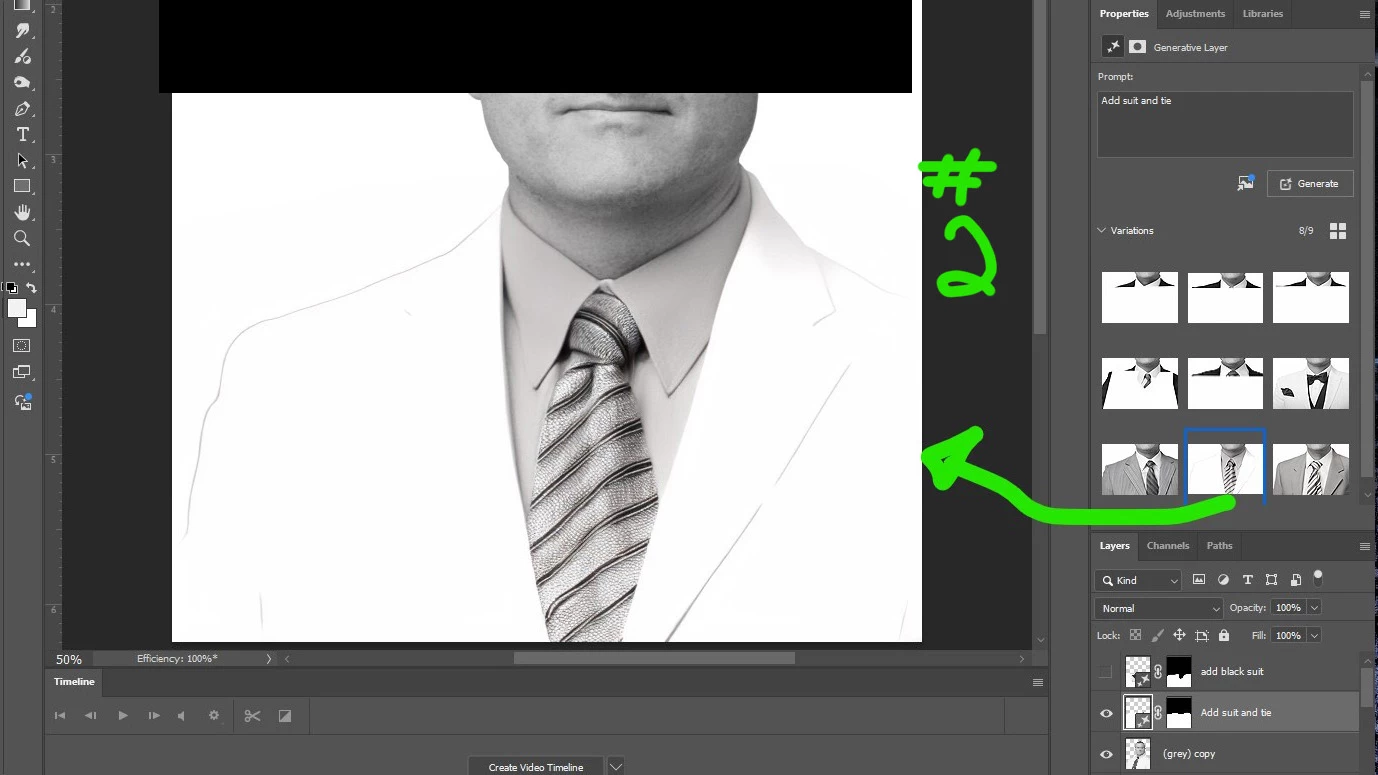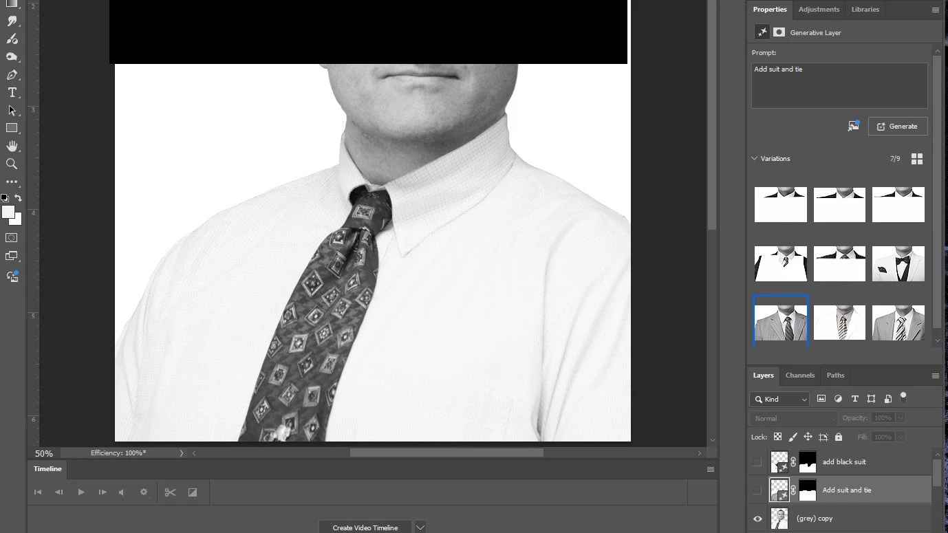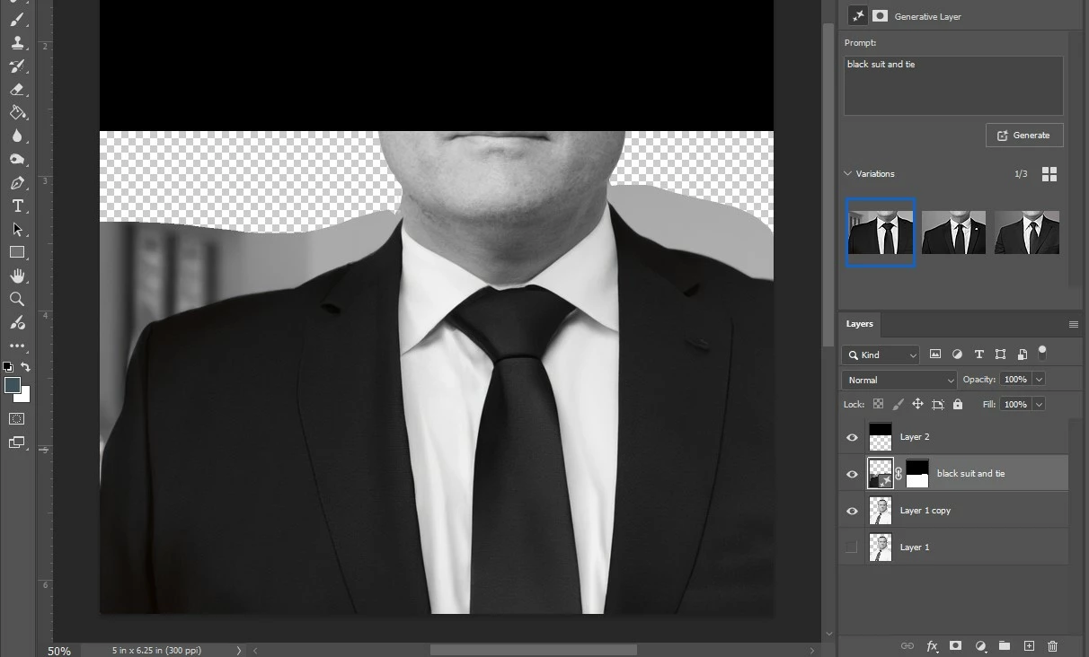 Black suit jacket and tie result on first generative fill request. Offer up all three versions with a black jacket. Of course, it appears to give each option a Peyton Manning length neck but beggers can't be choosers.