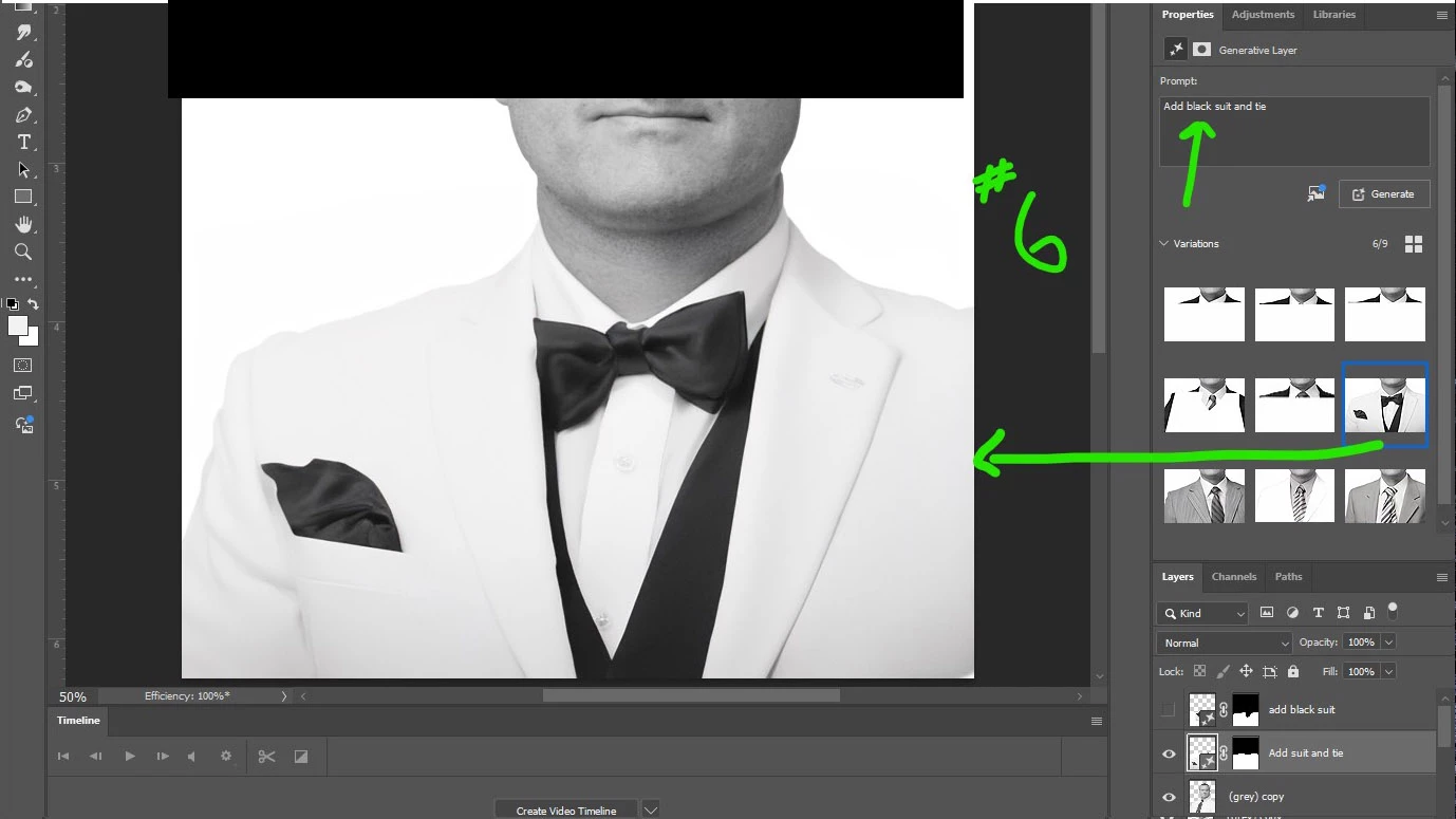 6 For the third option, it shows me once again that it can provide a full suit jacket and tie. Just not a black suit! Now I'm starting to think Adobe developers don't like me, or this AI tool doesn't. It offers a White Tux like jacket and bow tie. Looks great if that was what you asked for. Again, I prompted "add black suit and tie"