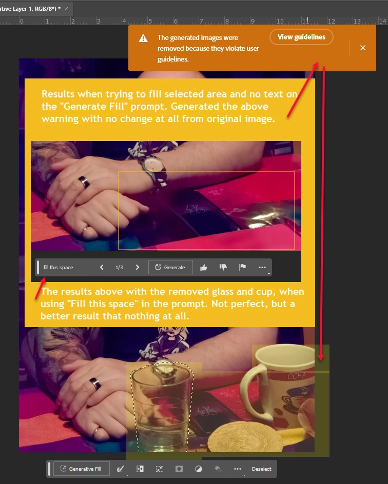 Thanks for the tip!  I used the prompt "Fill this space" with the selected area I wanted to change, and it did returned a half decent result!! (wanted to remove a coffee cup covering the elbow of person and the pasts of a hand that were covered by glass. After so many of 'violating guidelines' efforts, seeems like this little trick may be the start of being able to modify the image using Generative Fill. Image used for this test is included.