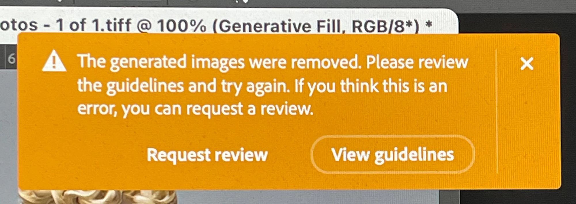 I updated this morning to the new version of Photoshop Beta 25.1. A  new alert now pops up when the  generated  image seemingly conflicts with the guidelines. We can now "request a review". I have not seen this before. See the image attached.