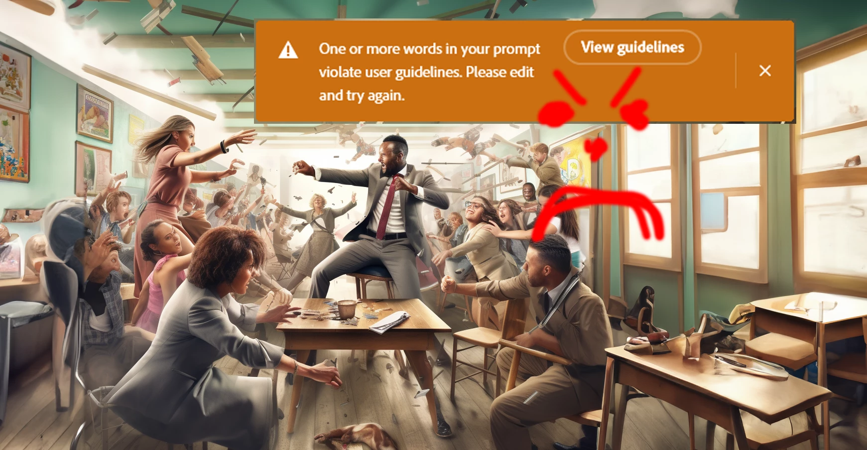 2. I was making a funny photo, sort of like a meme, with 2 groups of teachers fighting in a classroom (like a battle scene) and every (cursing removed) prompt I tried failed, even things like (destruction, hole in wall, fire, explosion, damaged building, etc.)