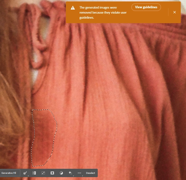 Hi! I've been trying to use generative fill in different contexts and one of the most useful one is when I use it to remove something from the photo. But somehow it's overly strict in following the guidelines even when they are obviously not violated. For example, if there is an adult clothed woman (!!! but what about professional work in future?) in a photo and I try to generative-fill a small region with a spot, in some images it shows a guideline violation error, but not in other with minimal differences in the subject.