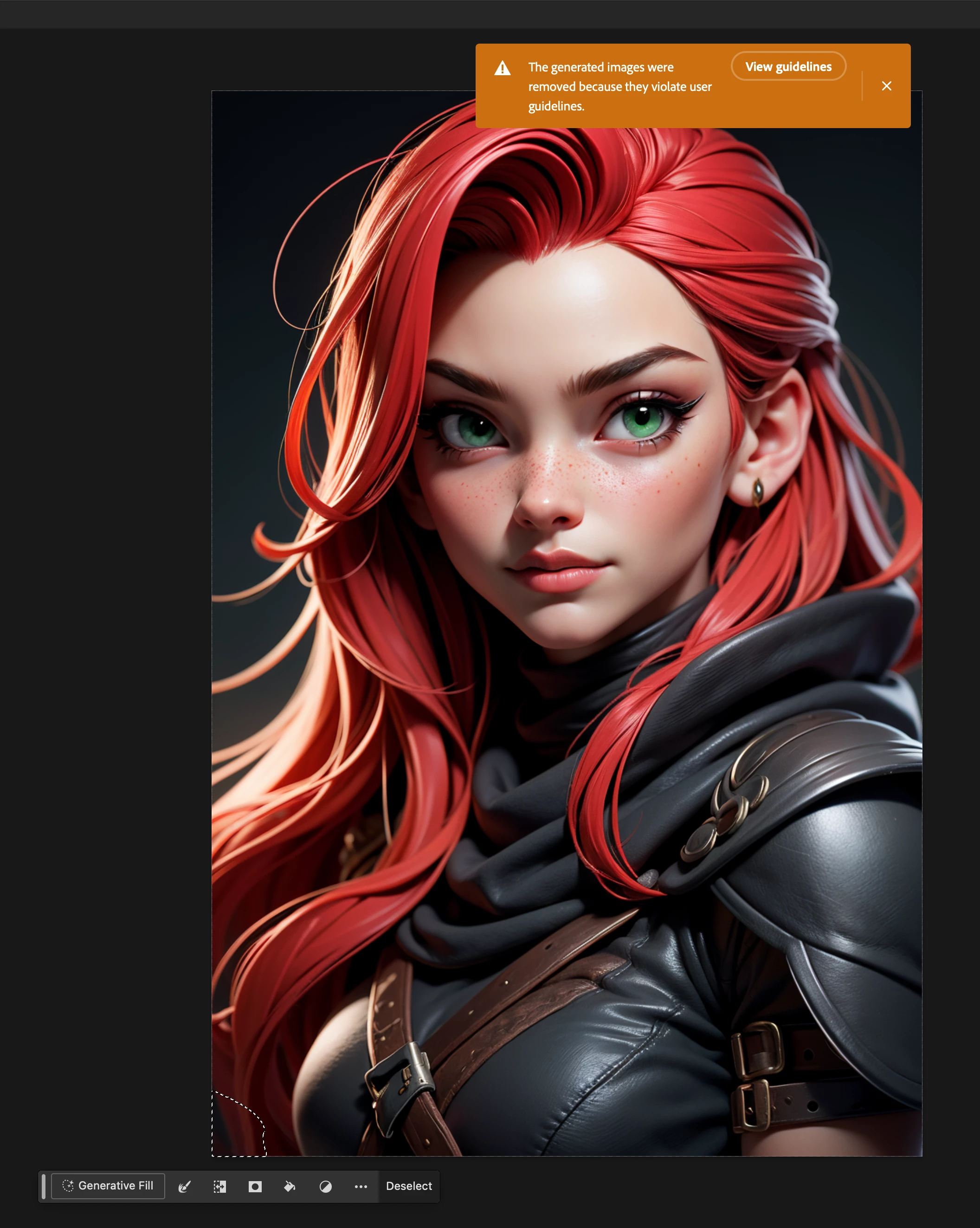 fix your garbage AI implementation, Adobe. name one freaking thing in this picture that violated ANYTHING. want to fix a little bit of hair in the corner - 'ThE gEnErAtEd ImAgEs WeRe ReMoVeD bEcAuSe ThEy ViOlAtE uSeR gUiDeLiNeS.'