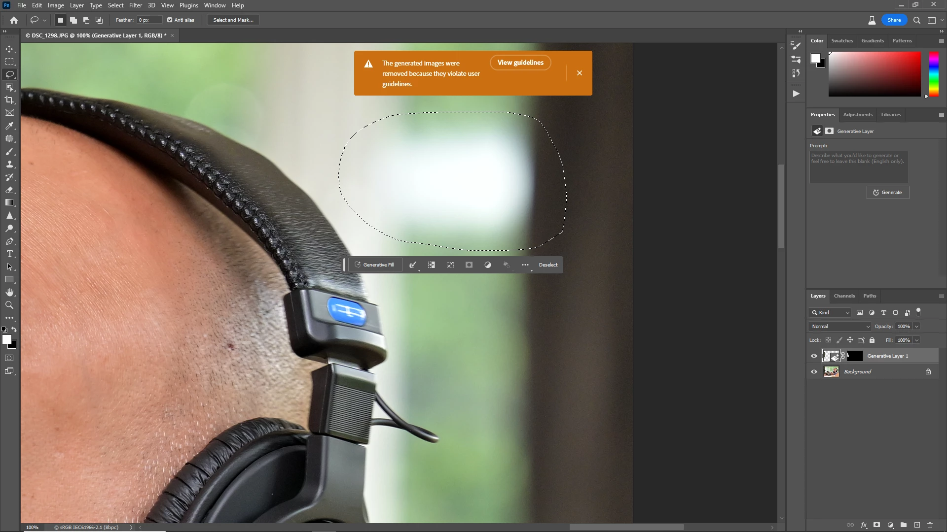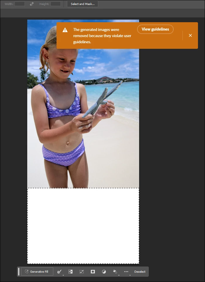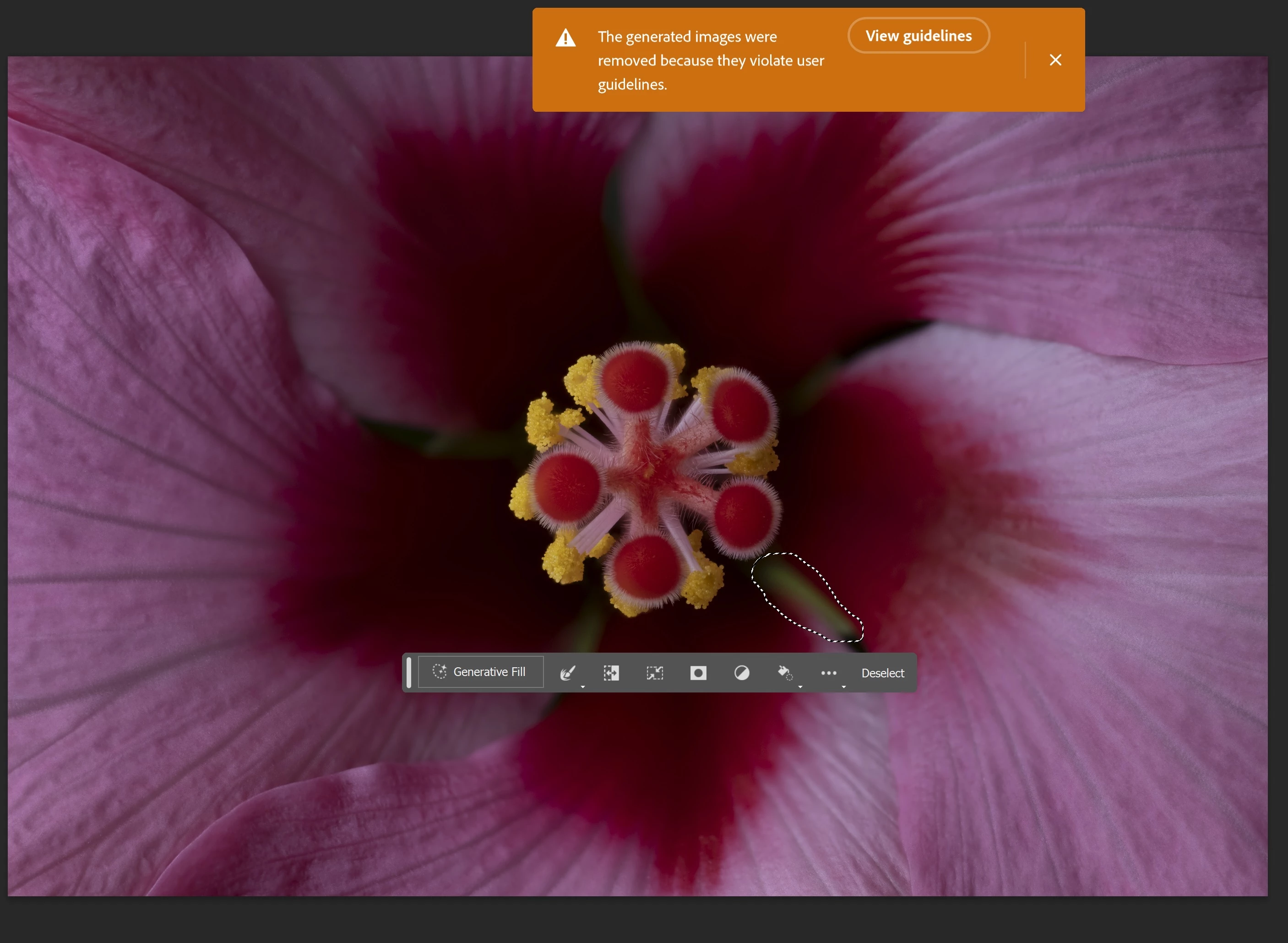 I attempted to use generative fill on a picture of a flower of the selection with no prompt, but was rejected due to a false user guidelines violation. I can supply the original image but its too large to attach.