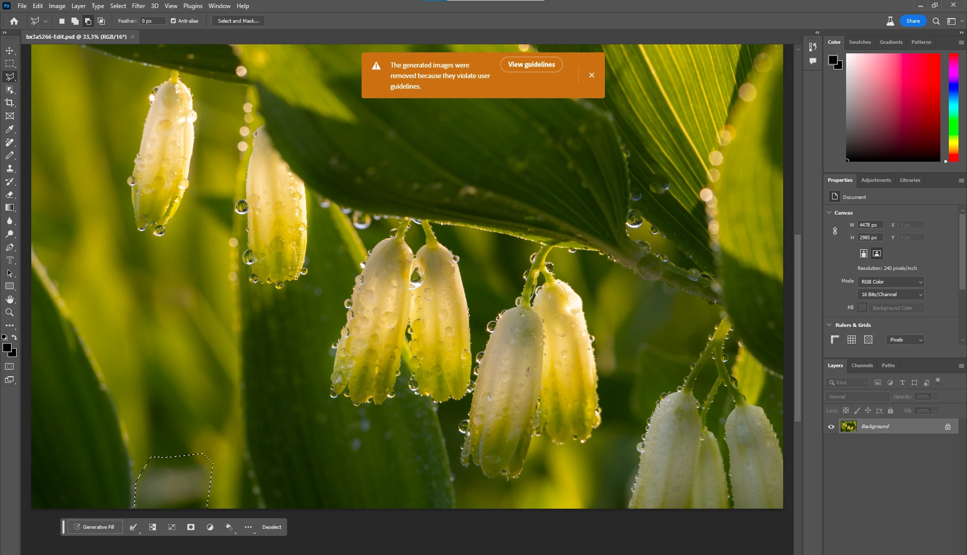 I can't use generative fill for this area without getting this message. I have tried different selections too but it seems out of focus green leaves generate so nasty content that it's prohibited 🙂