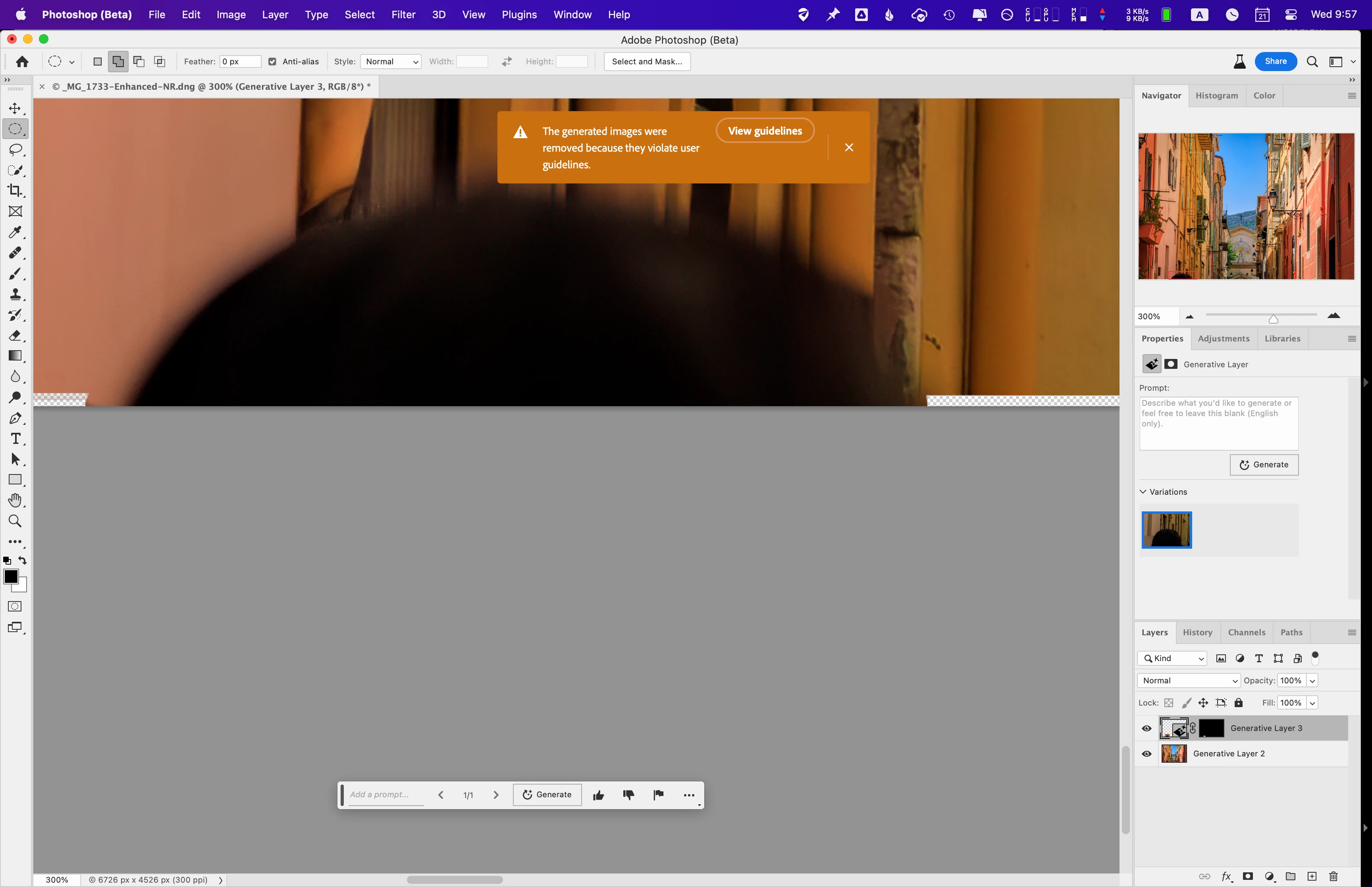 The biggest problem I have in generative fill is a repeating error message that generative images have been removed becaue they violate user guidlinges. This can happen  on any kind of image. Tring to extend the  image on an innocent photo of a person it also gets this error.  Photoshop Beta 24.7, Mac OS Ventura 13.4