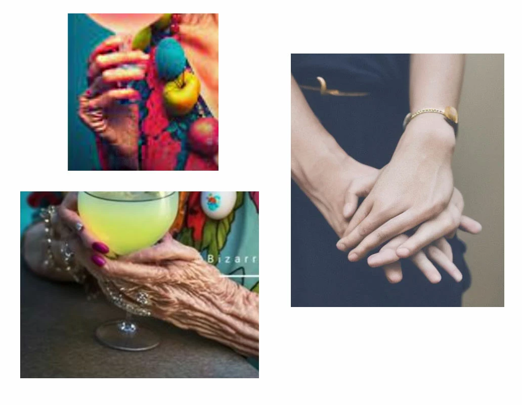 She has six fingers on her left hand and the inner bend of the elbow line on the raised arm is wrong.  A few more "AI hands":