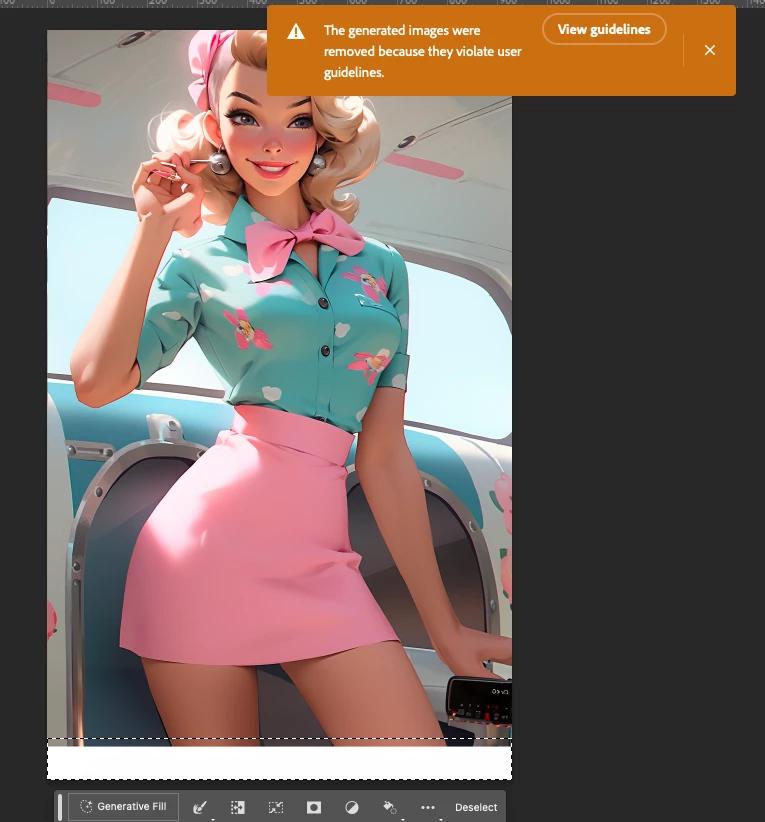 Stop the patronizing and let people create their ideas. I always get "Violation of user guidelines" when i want to replace or change clothing of any human. This is idiotic and i wont buy the new Photoshop if this nanny idiocy persists. The "Violation of user guidelines" should be eliminated completely. Free design for free people. And we have paid >25 per month for Photoshop, (I not yet-still in the 7 days trial mode, but i wont buy/prolong the sub if this "violation...stupid popup" persists, because this is a showstopper and makes the new AI feature useless.