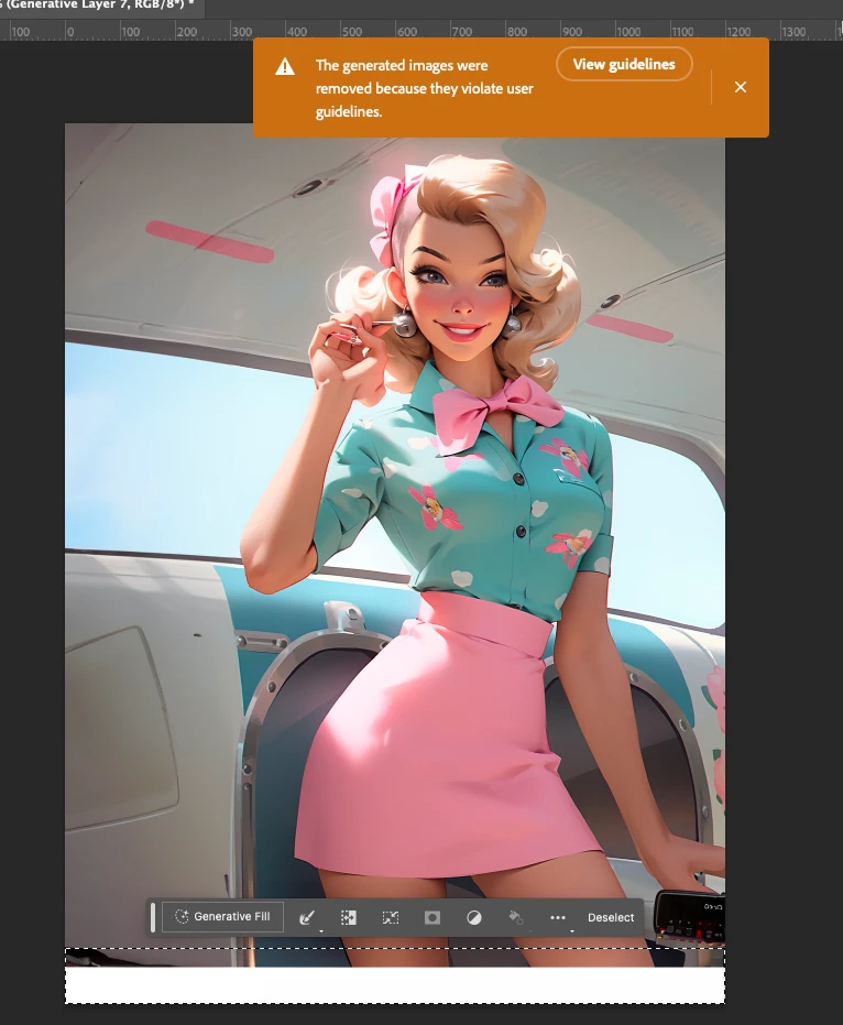 I've read that there were ways to go around the low-res (1024x1024px) of the generated fills by selecting smaller parts of the images. But do you know any ways to go around this abusive guidelines-blocking process ?