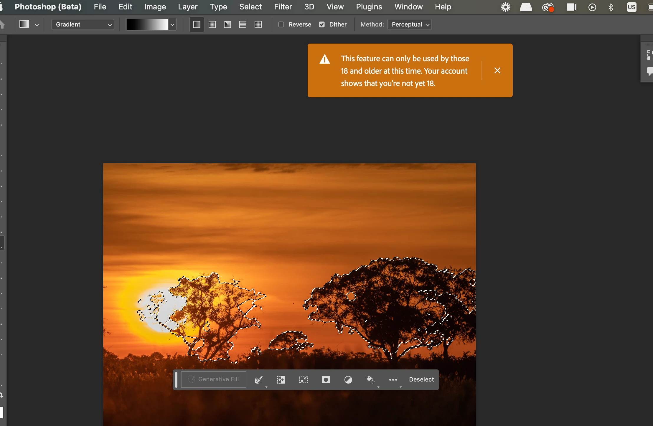 Why is the Generative Fill button greyed out if I'm over 18?