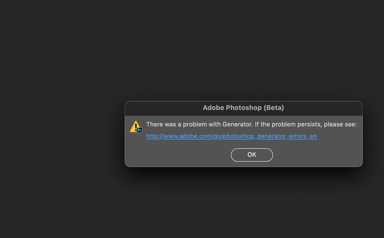 After downloading and installing Photoshop 2023 Beta 25.0, I keep getting the the following error message about Generator.