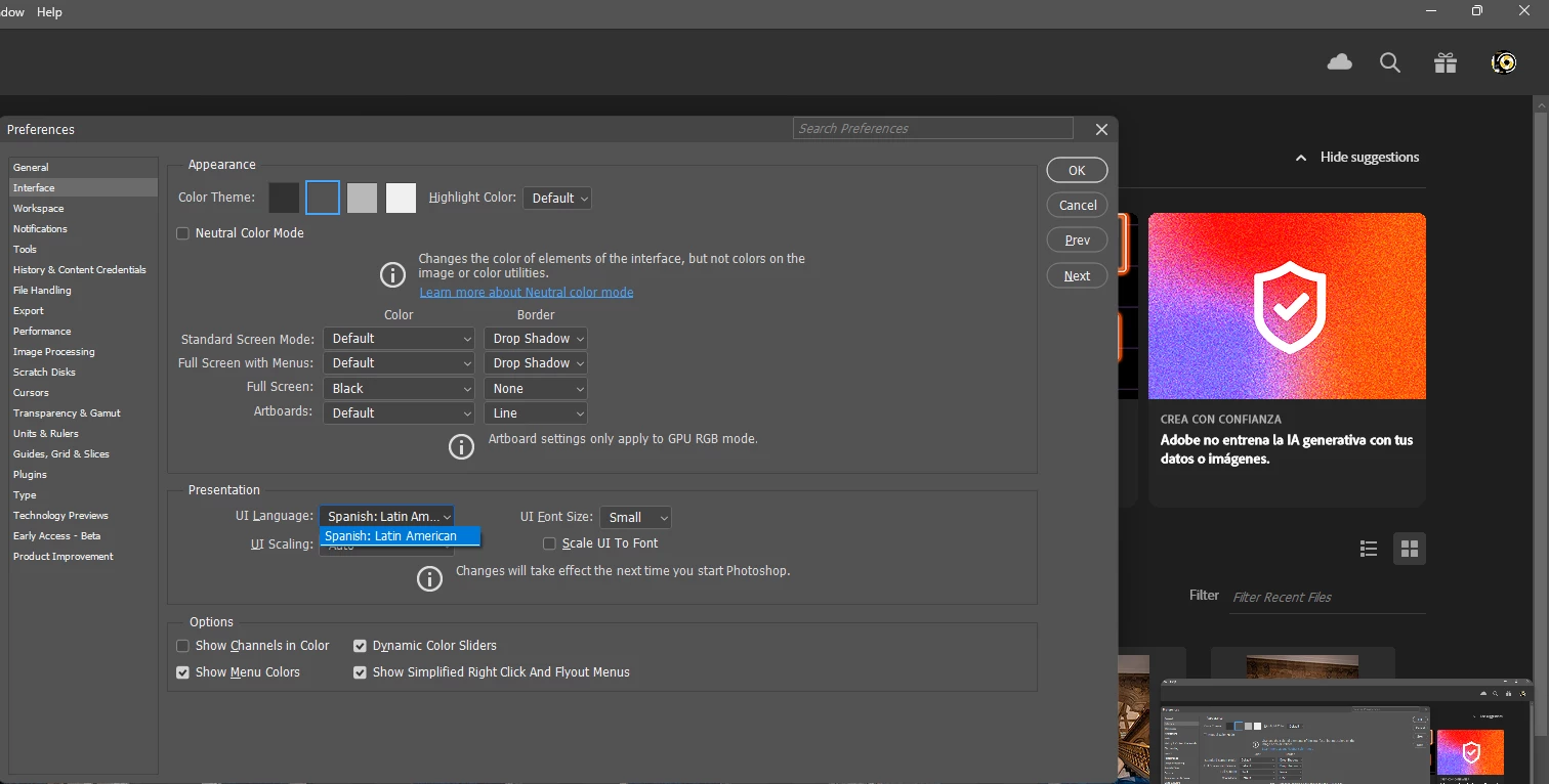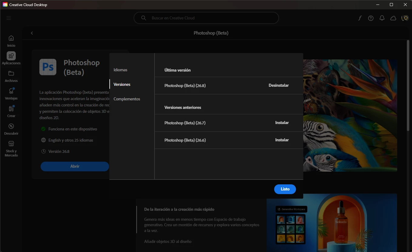 The latest version of Photoshop beta is in English and can't be converted to Spanish.