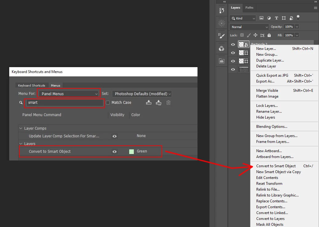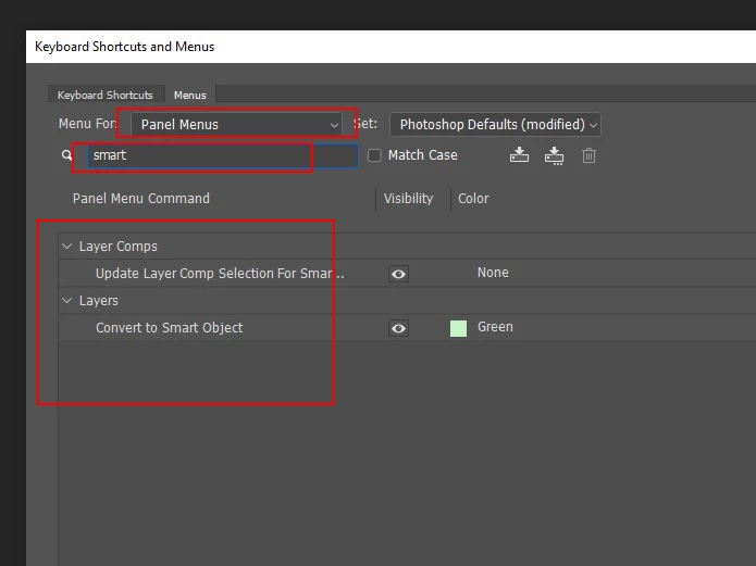 2. In Photoshop Beta\photoshop (isnt displayed in neither) , I want to highlight the command "New Smart Object via Copy" in the Layer panel, same as I do for other commands. However, I can only find it under the Application menus (Layer > Smart Objects > New Smart Object via Copy) and can't find it under "Keyboard Shortcuts and Menus > Panel Menus" panel.