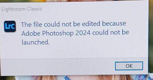 Now when I try to open photos from LR 12.4 using the "edit in...", it hangs up for a time and then comes up saying "The file could not be edited because Adobe Photoshop 2024 could not be launched."