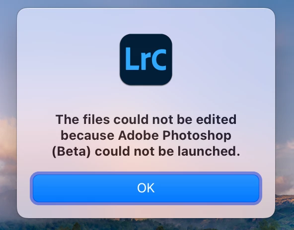 The files could not be edited because Adobe Photoshop (Beta) could not be launched.