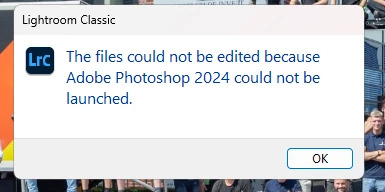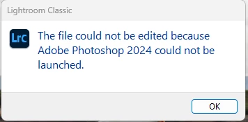 Now when I try to open photos from LR 12.4 using the "edit in...", it hangs up for a time and then comes up saying "The file could not be edited because Adobe Photoshop 2024 could not be launched."