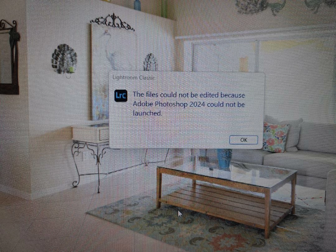 When I try to open a set of pics to edit as layers in Photoshop from LrC, Photoshop opens but stays in the first screen. Then I get a message in LrC that says "The files could not be edited because Adobe Photoshop 2024 could not be alunched." Here's a couple of pics.