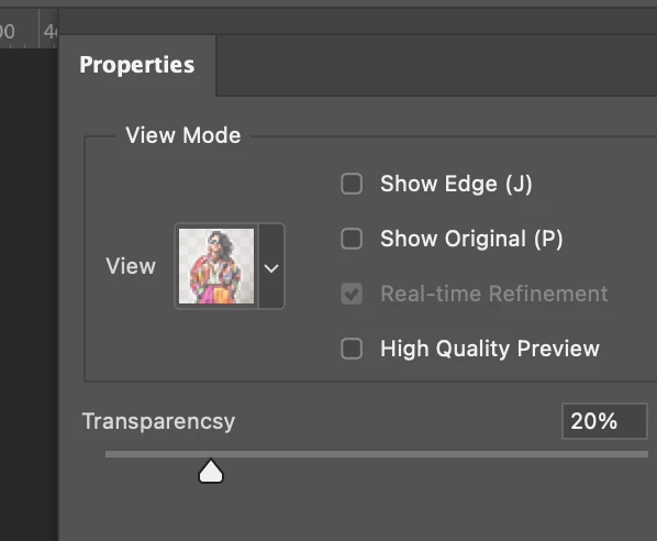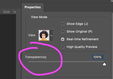 Click on the Select and Mask button and in Properties we see 'Transparencsy'.