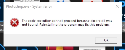 Today after the update I encountered that my Photoshop won't open due to this error: “(Photoshop beta.exe) Failed to continue code execution because the system did not detect dxcore.dll. To fix this error, try reinstalling the application.”
