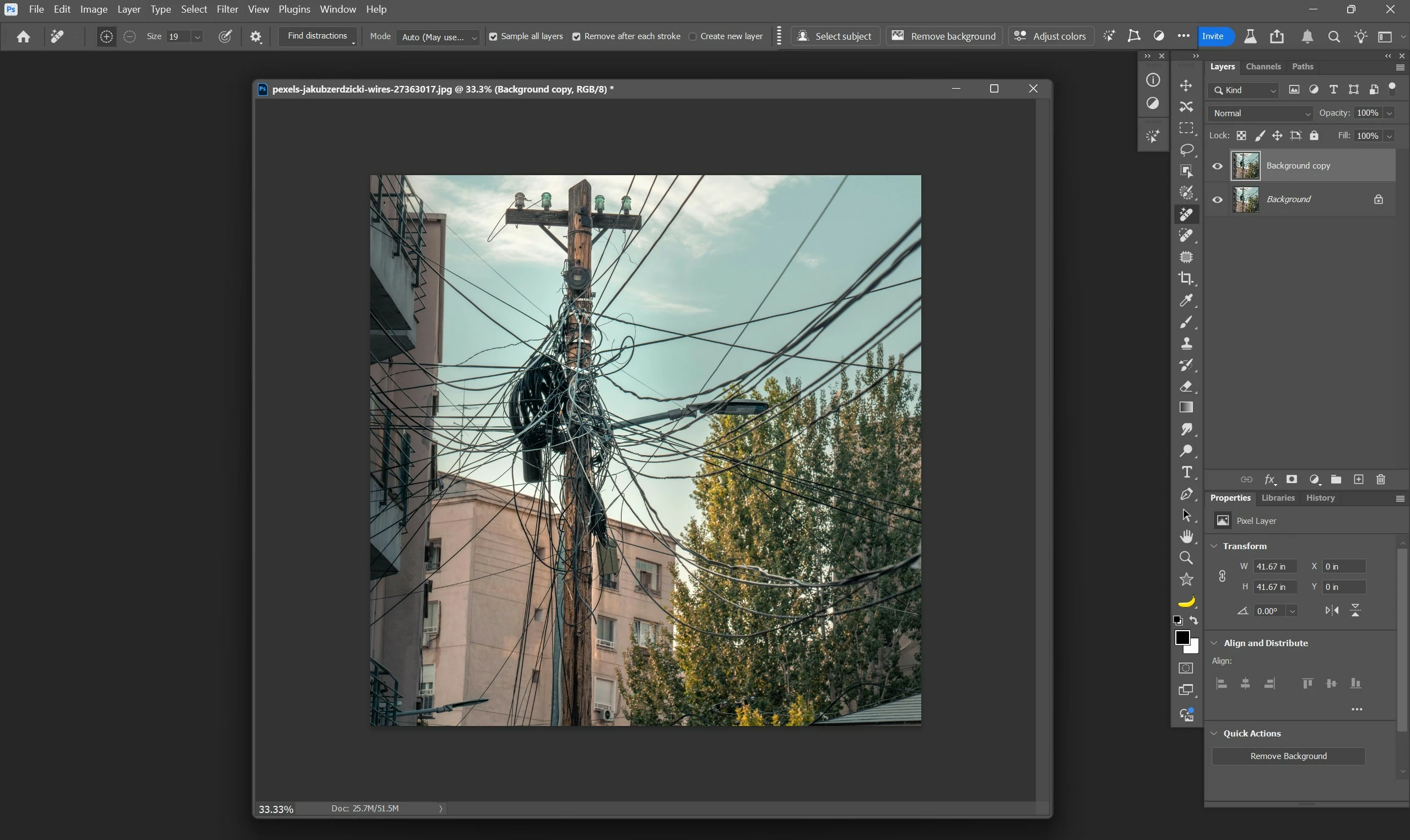 3. If the program error still occurs, open an image with some wires and try Wire Removal by opening the [Find distractions] in the Remove Tool option bar and clicking [Wires and cables]. Does it remove the wires without the error?