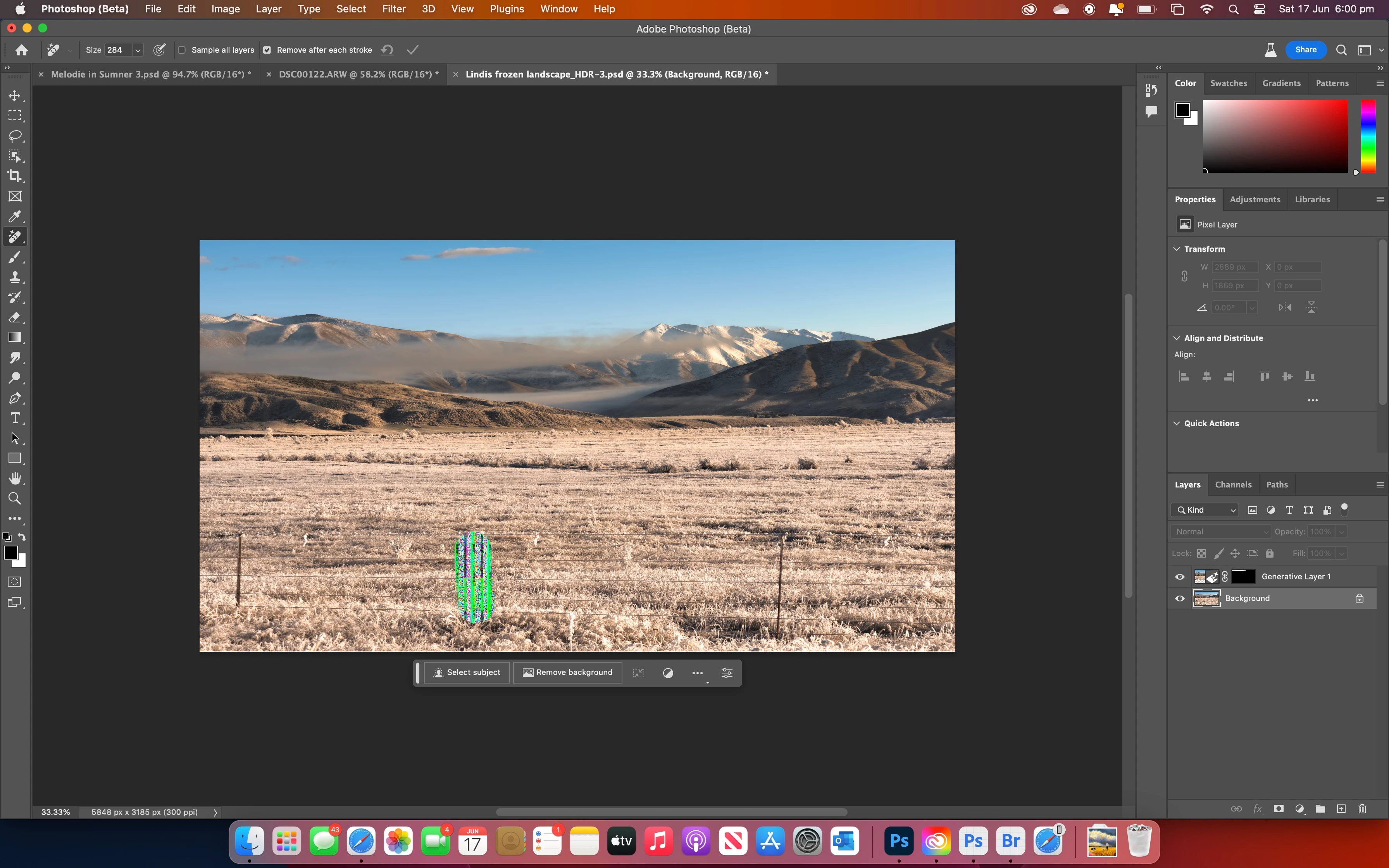 When using the remove tool in the latest beta version of Photoshop, I end up with a black smudge mark (see attached photo). Am I the only one with this issue? Thanks