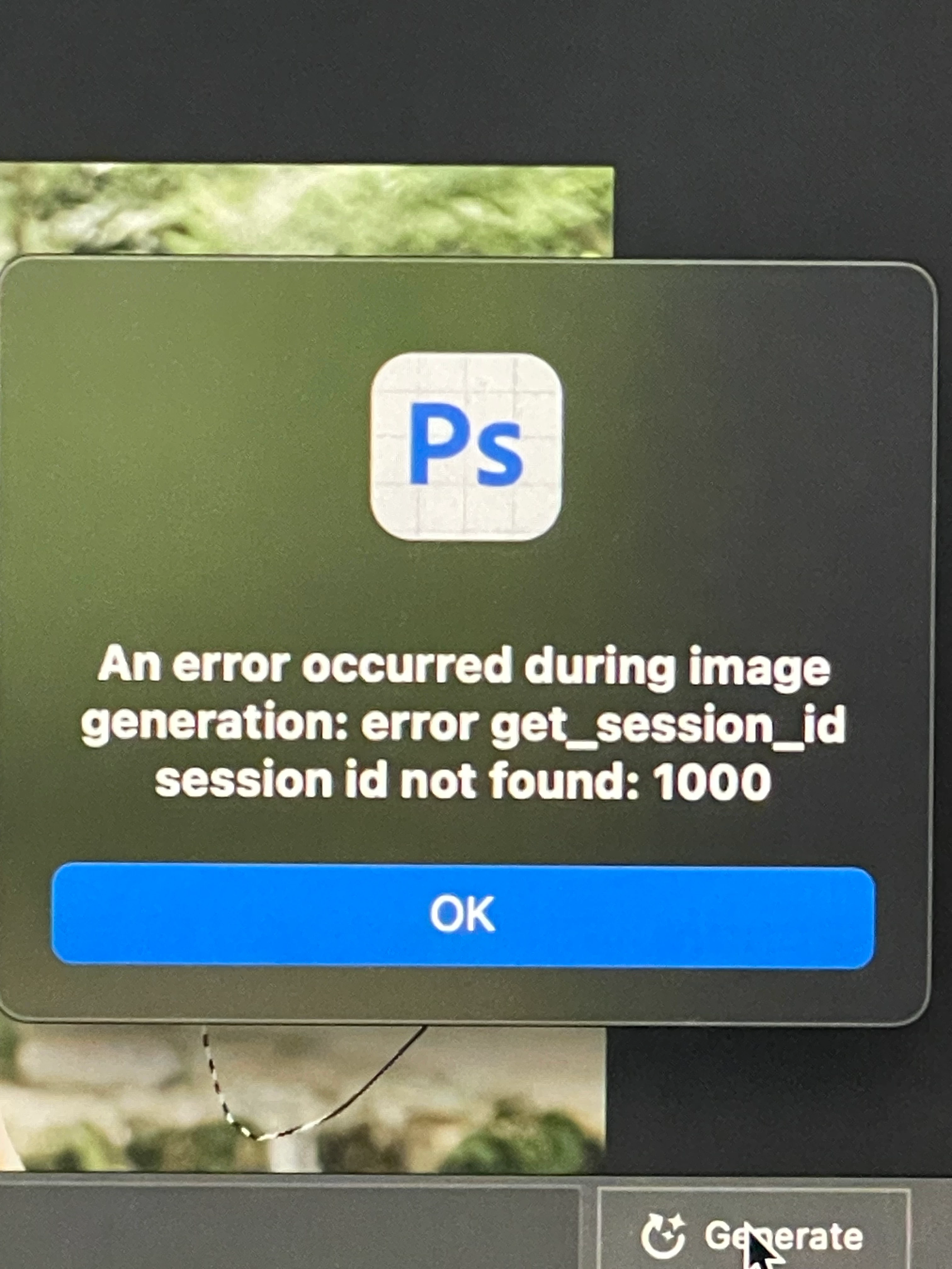 This is what I get when I clicker generate on the new beta photoshop generative ai feature [An error occurred during image generation: error get_session_id session id not found: 1000