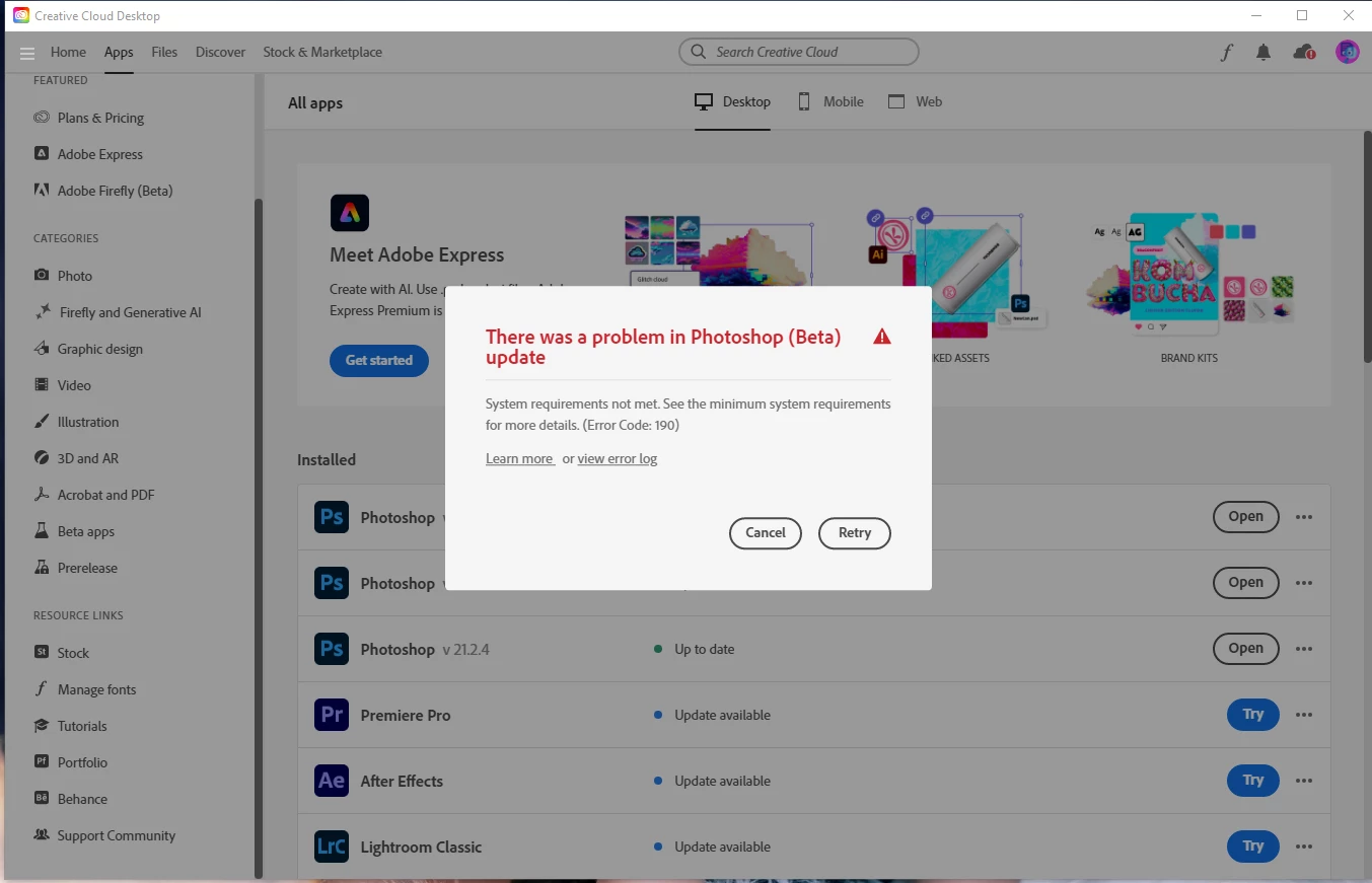 Creative Cloud app is unable to update Photoshop Beta v25.1
