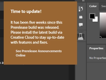 Today I got a brownish-colored popup in PS beta saying "Time to update! It has been five weeks since this Prerelease build was released. Please install the latest build via Creative Cloud to stay up-to-date with features and fixes." It then provides a link to "See Prerelease Announcements Online" but the link simply brings me to the adobe.com landing page.