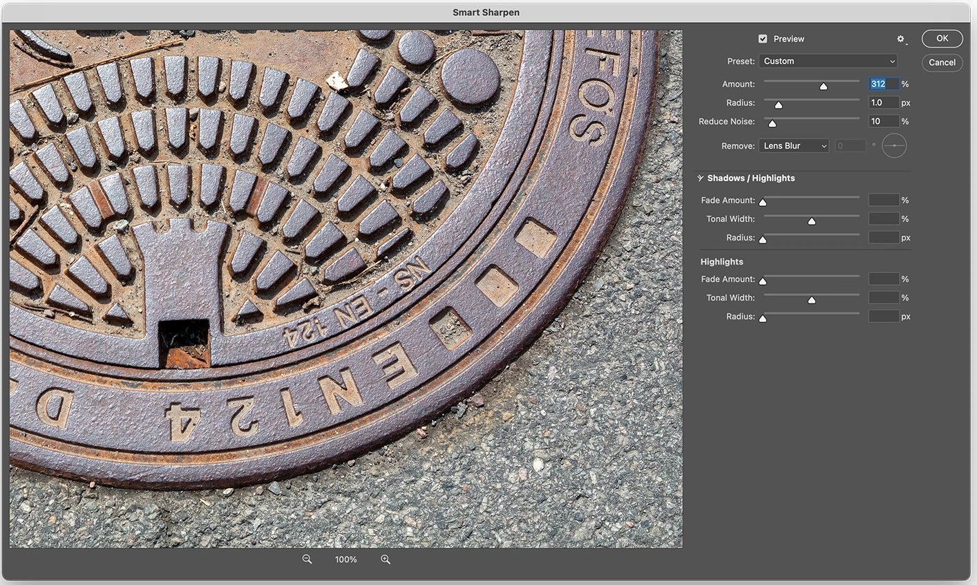 Smart Sharpen dialog panel error when accessing adjustment sliders section.