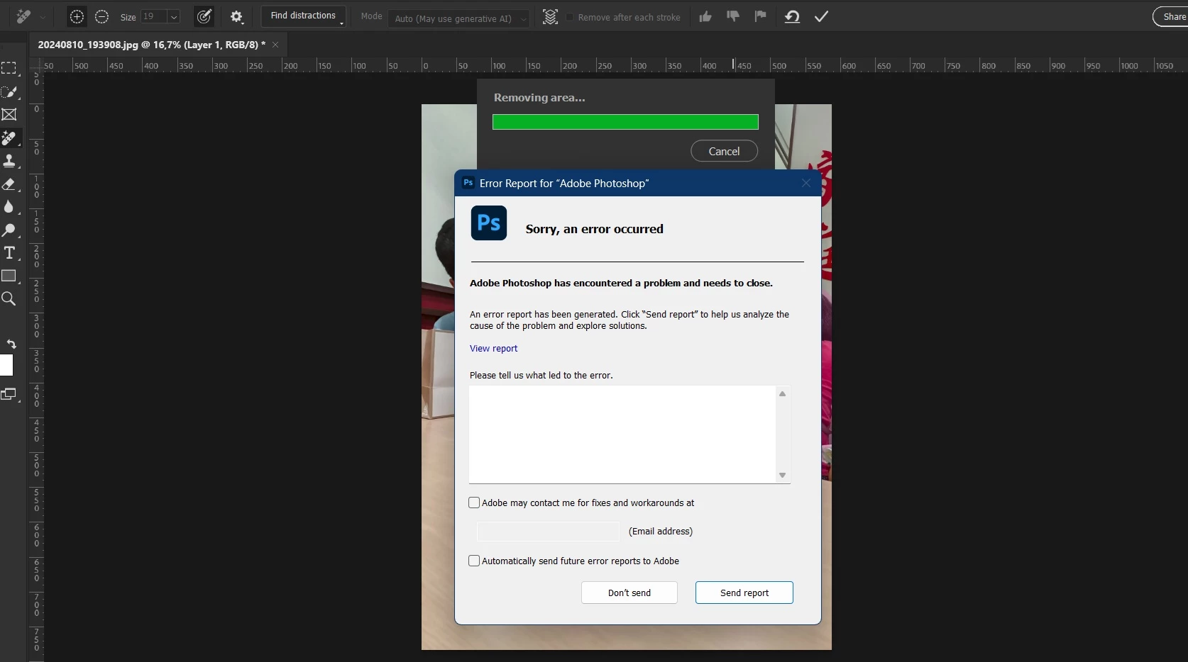 Adobe Photoshop 2025 version 26.0 for Windows seems like bug when applying Find Distraction (People) evertime execution then the Photoshop error (the screen shot attached).