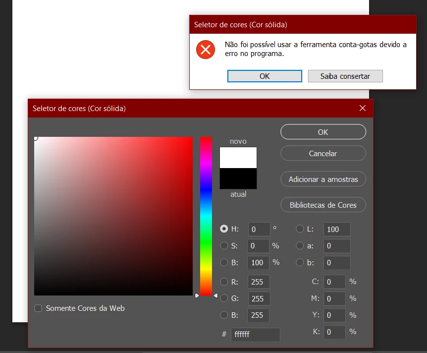 Erro "não foi possível usar a ferramenta conta-gotas devido ao erros no programa"